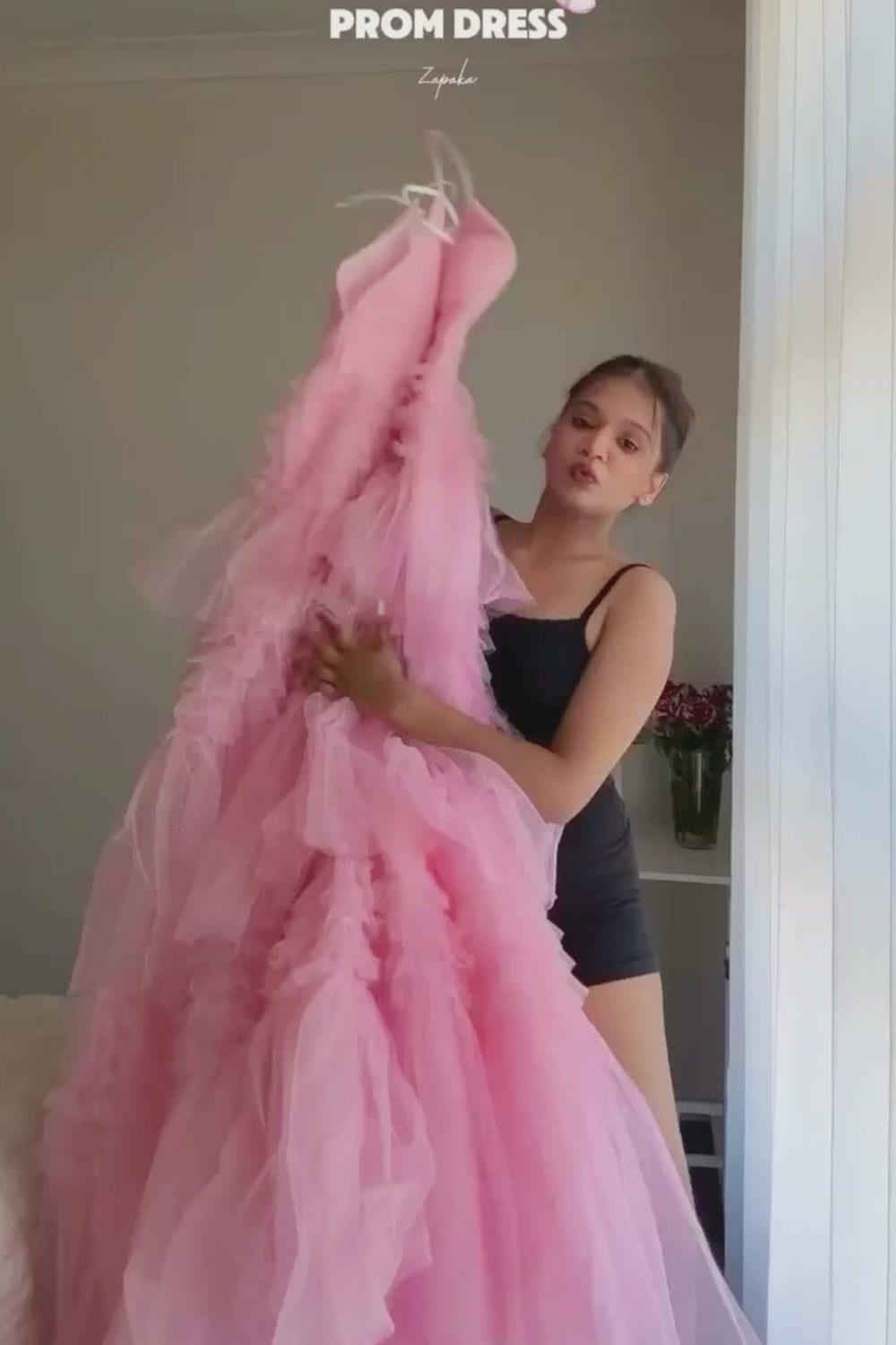 Pink Tiered Spaghetti Straps Princess Prom Dress with Slit