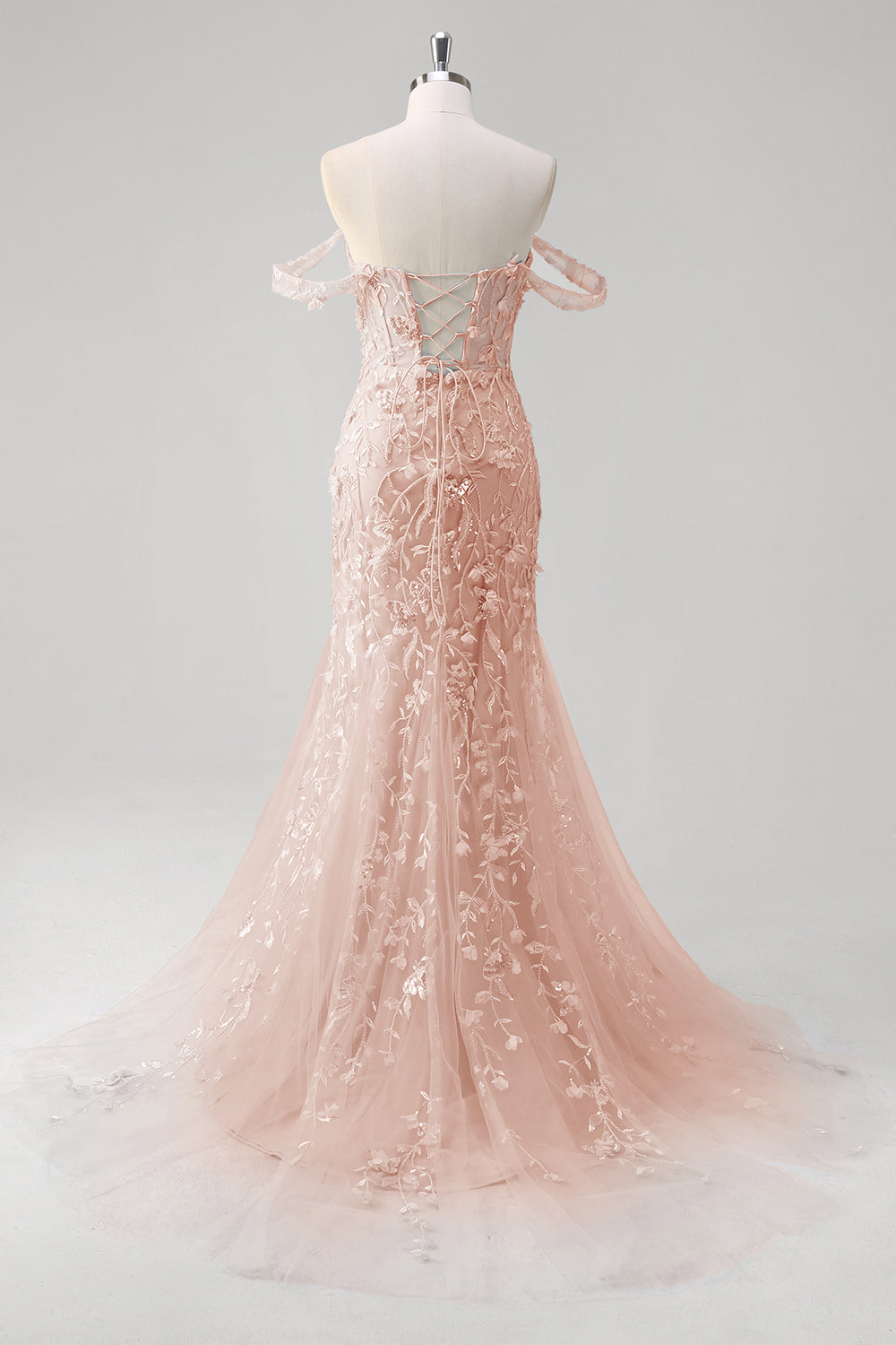 Blue Mermaid Off the Shoulder Sequin Floral Corset Prom Dress