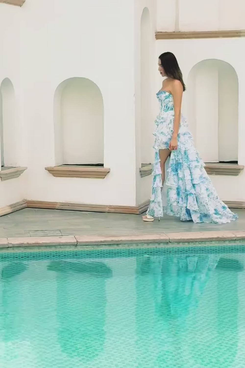 Blue White Flower A-Line Sweetheart Tiered Long Prom Dress with Slit