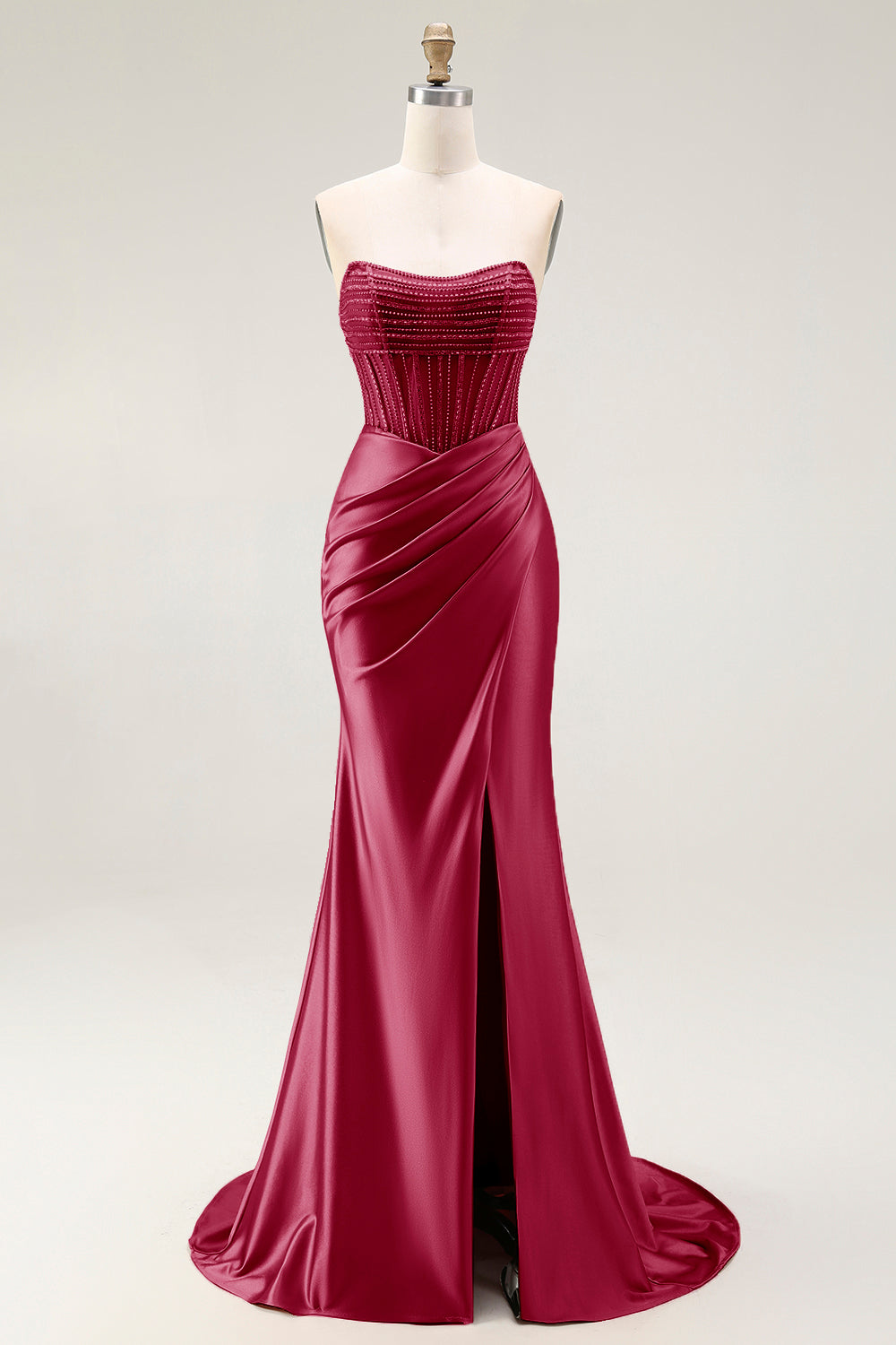 Blush Mermaid Sheer Corset Beaded Strapless Long Prom Dress With Slit