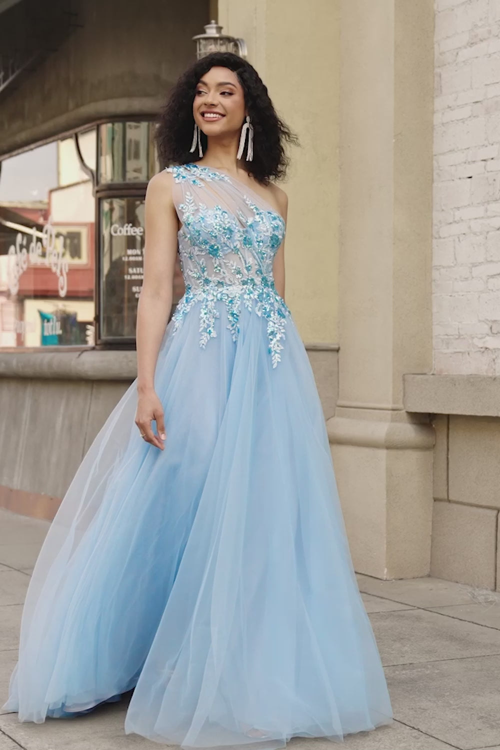 Gorgeous A Line One Shoulder Light Blue Corset Prom Dress with Appliques