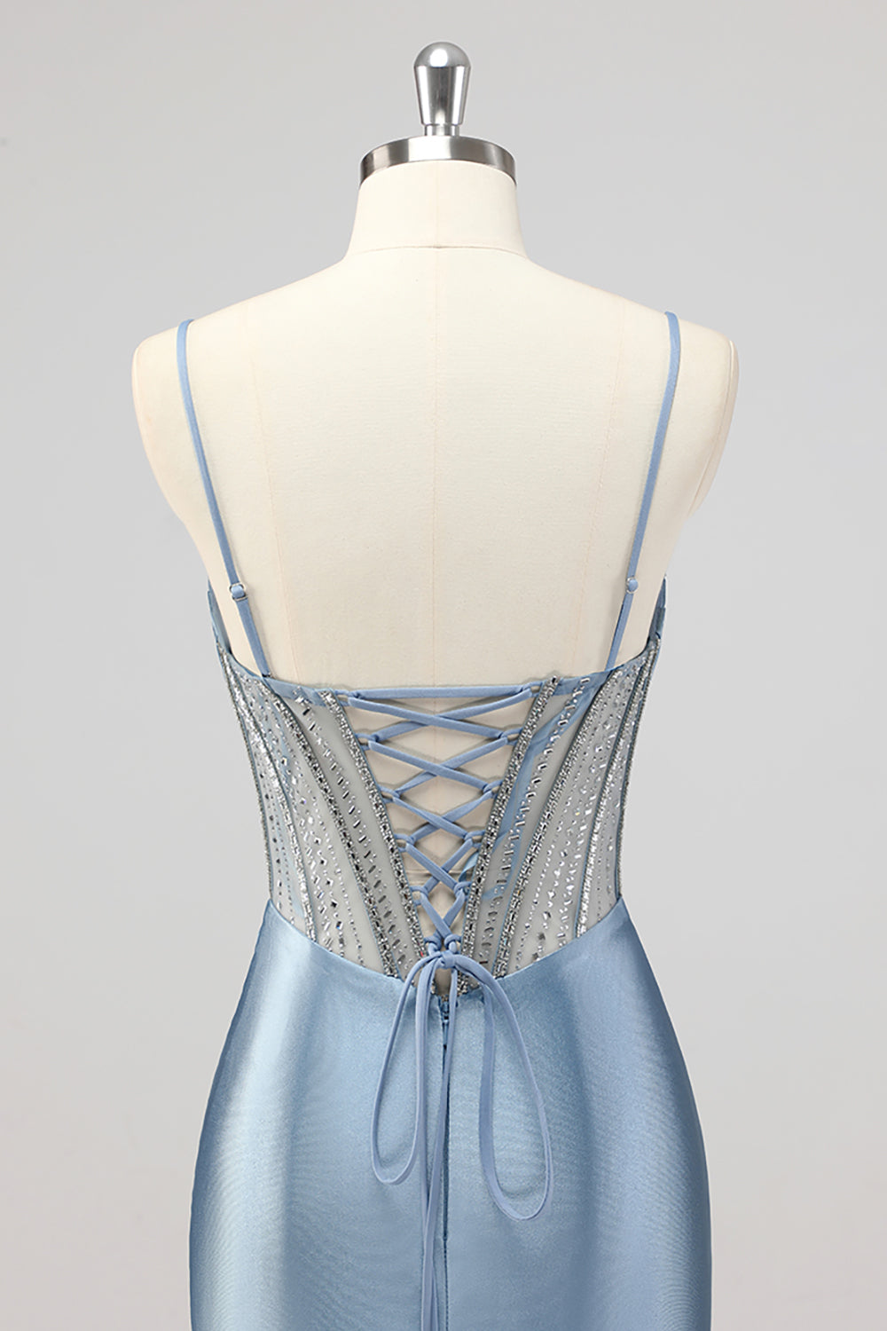Mermaid Grey Blue Corset Beaded Prom Dress with Slit