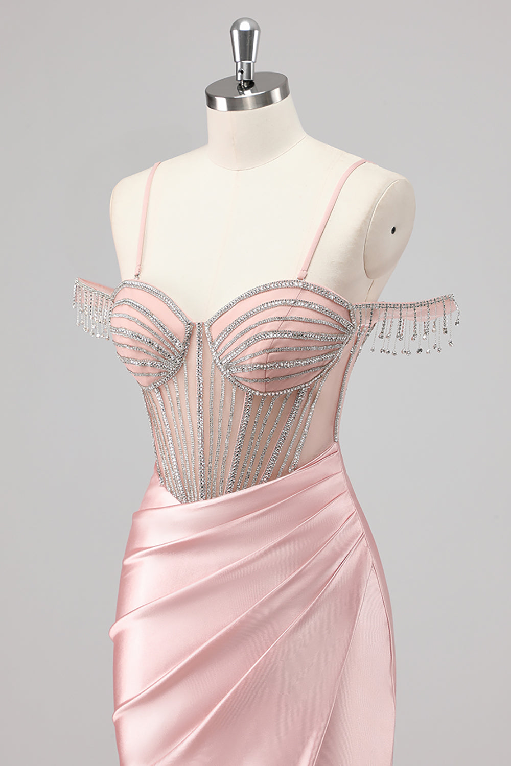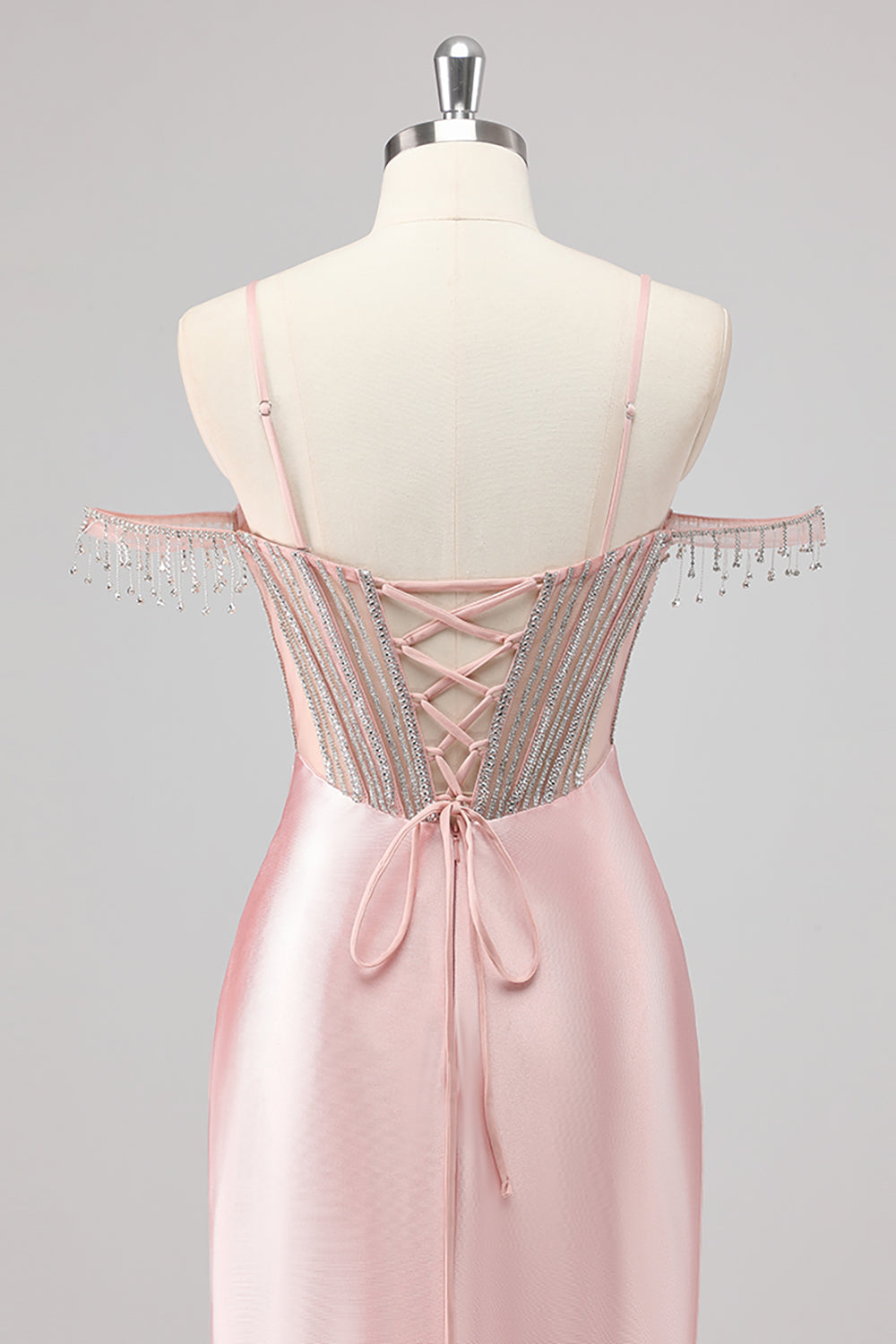 Sparkly Grey Blue Sheath Spaghetti Straps Corset Beading Long Prom Dress with Slit