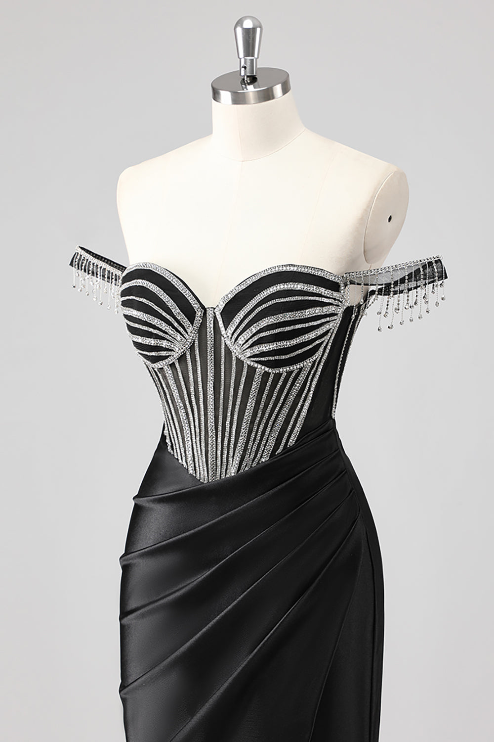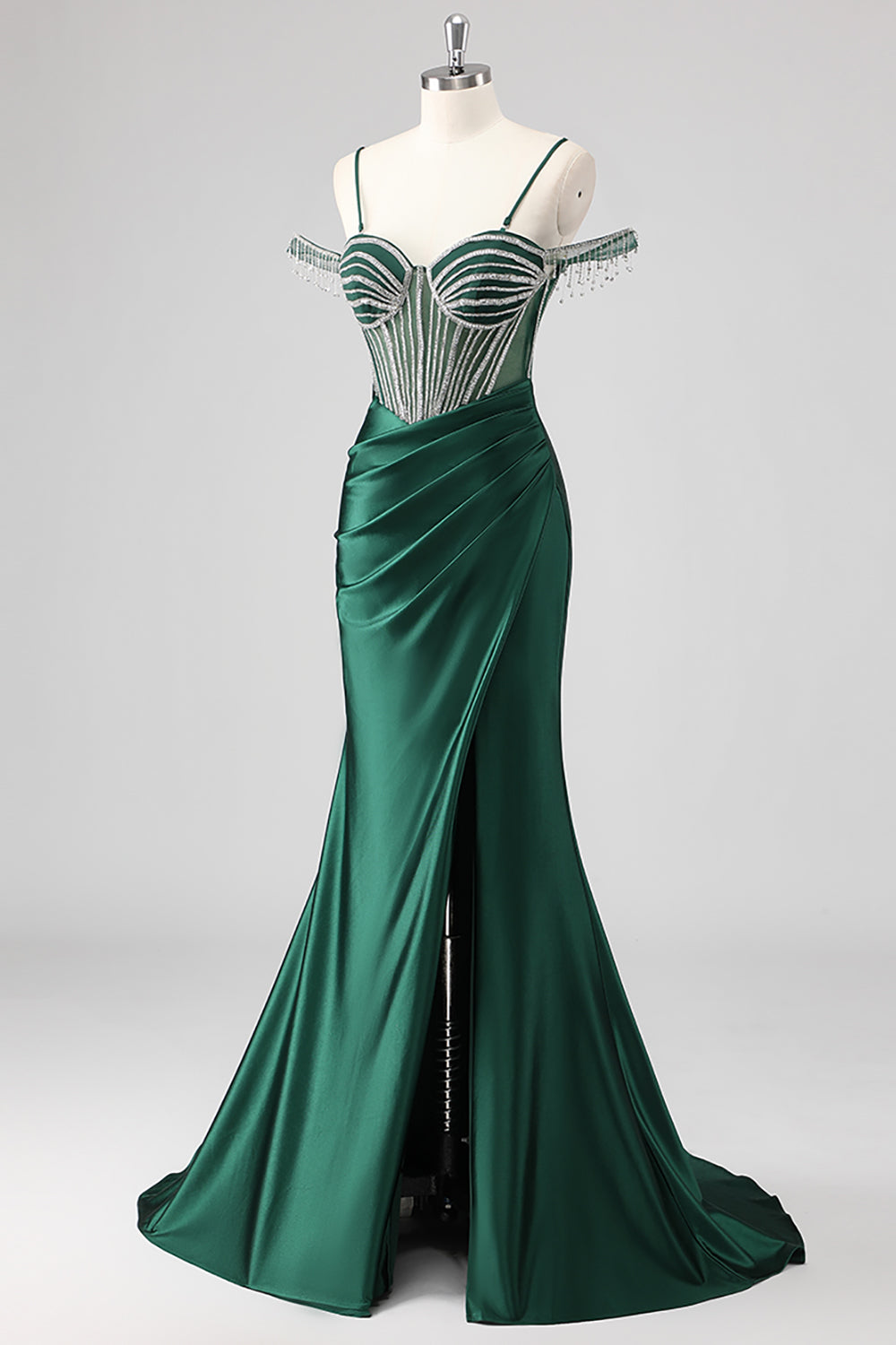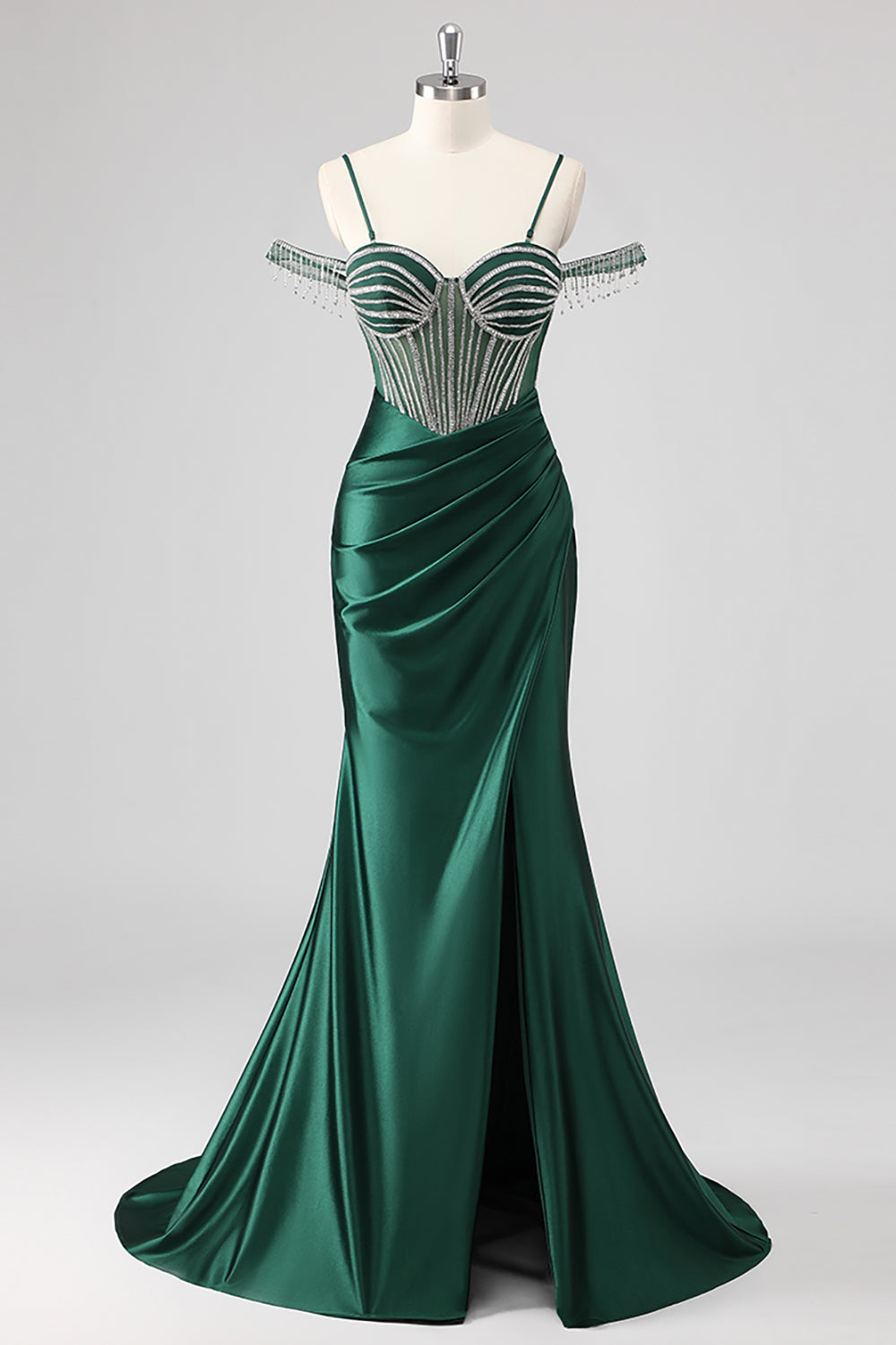 Mermaid Cold Shoulder Beaded Long Pink Prom Dress with Slit