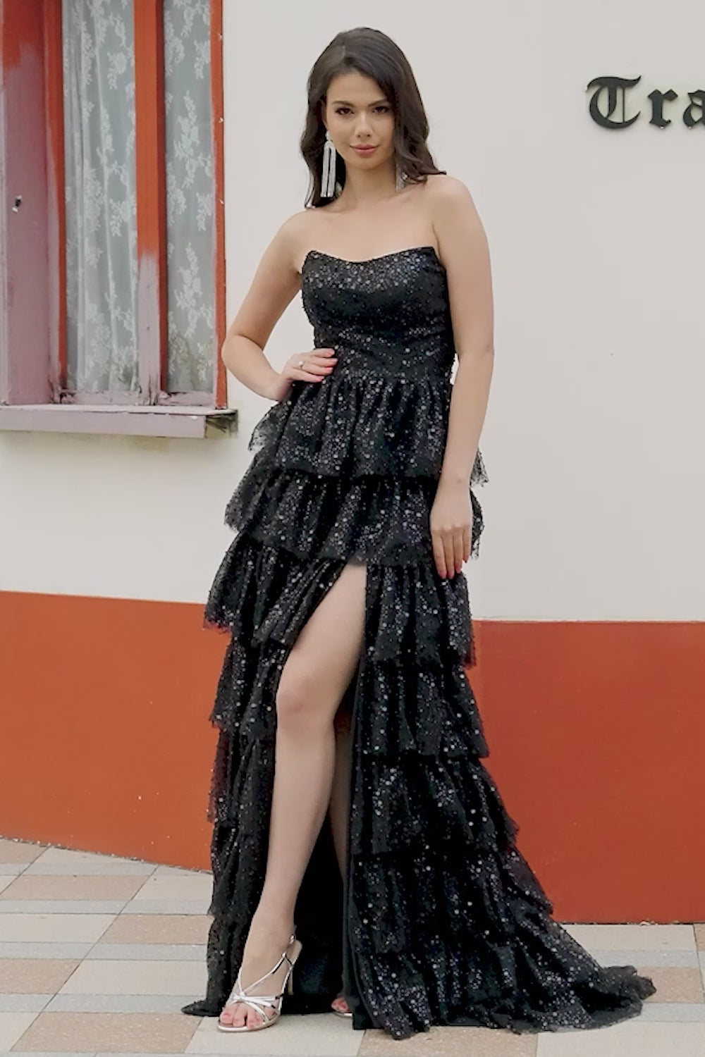 Stylish A Line Strapless Black Sequins Long Prom Dress with Ruffles