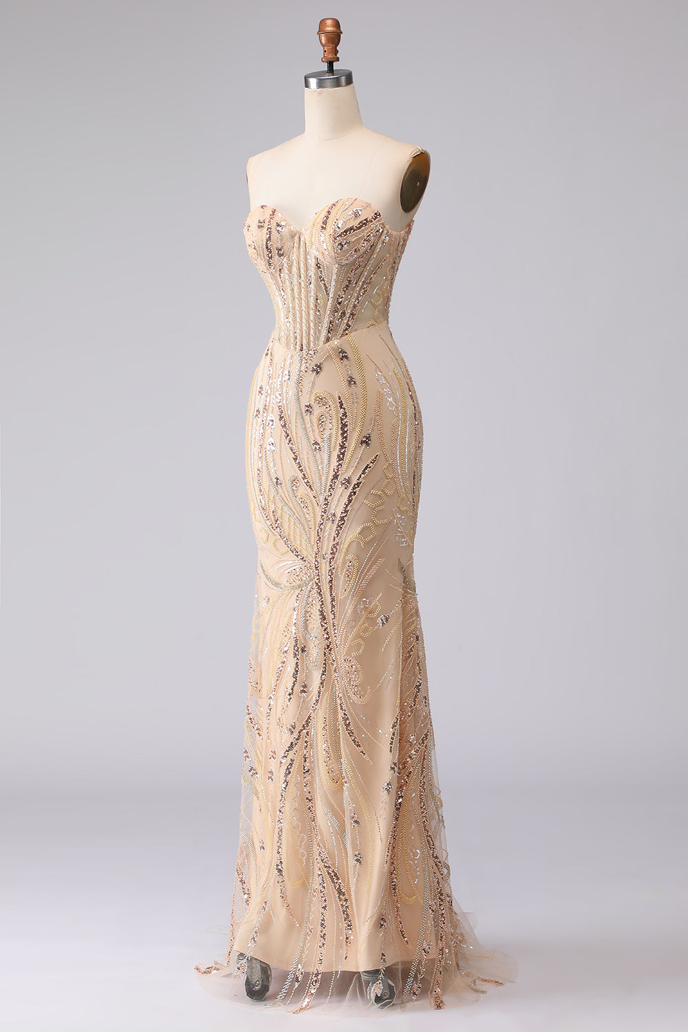 Champagne Mermaid Strapless Beaded Sequin Long Prom Dress with Lace Up Back