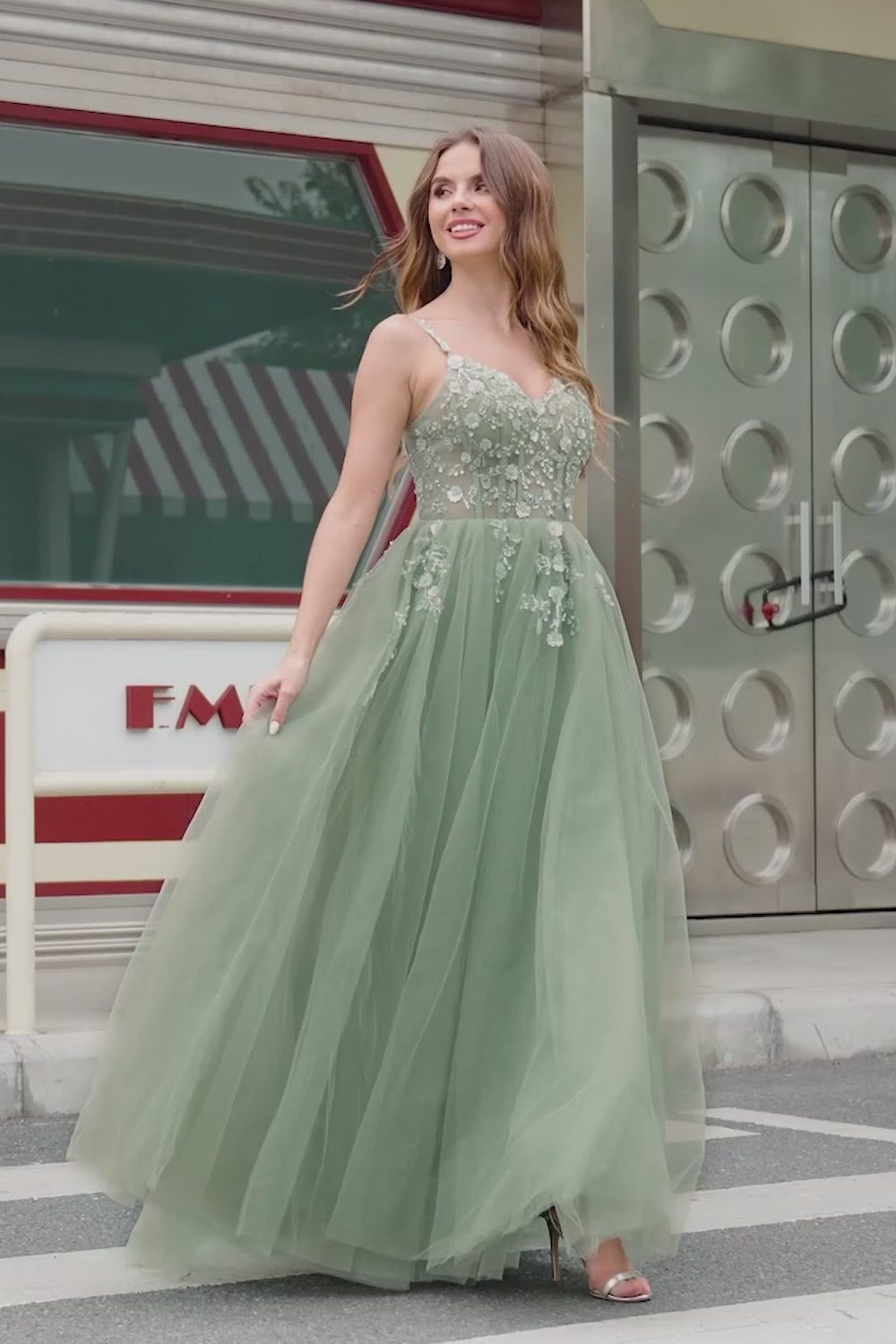 Green A Line Corset Sequin Tulle Long Prom Dress with Lace Up Back
