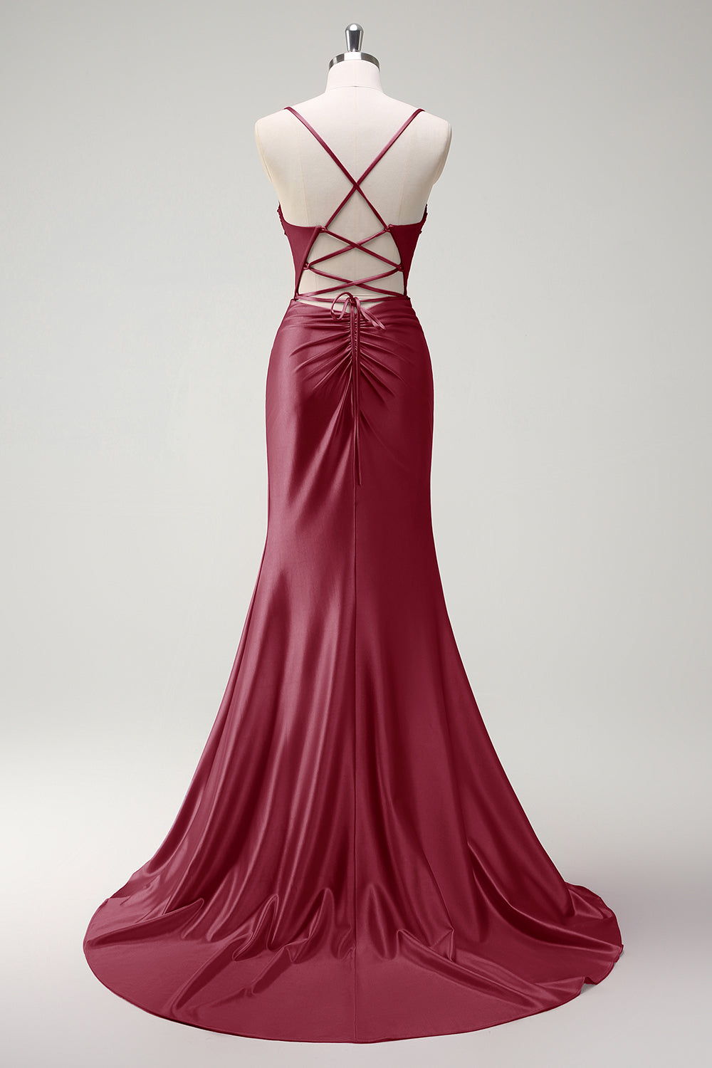 Fuchsia Mermaid Spaghetti Straps Beaded Corset Satin Long Prom Dress with Slit