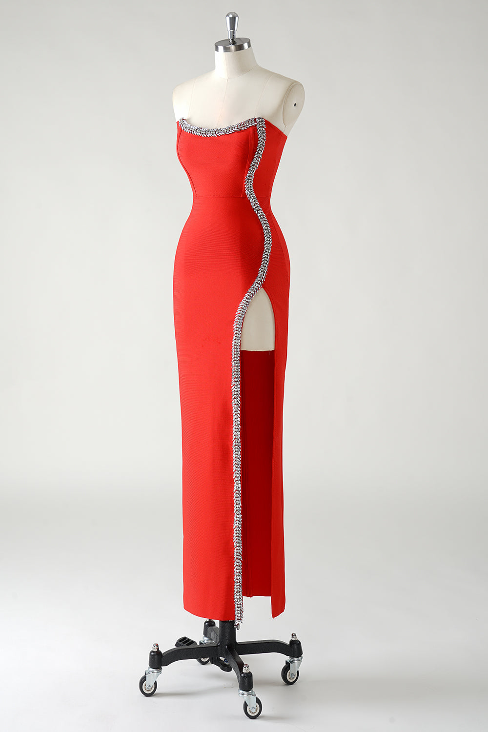 Sparkly Red Sheath Strapless Rhinestones Tea Length Prom Dress with Slit