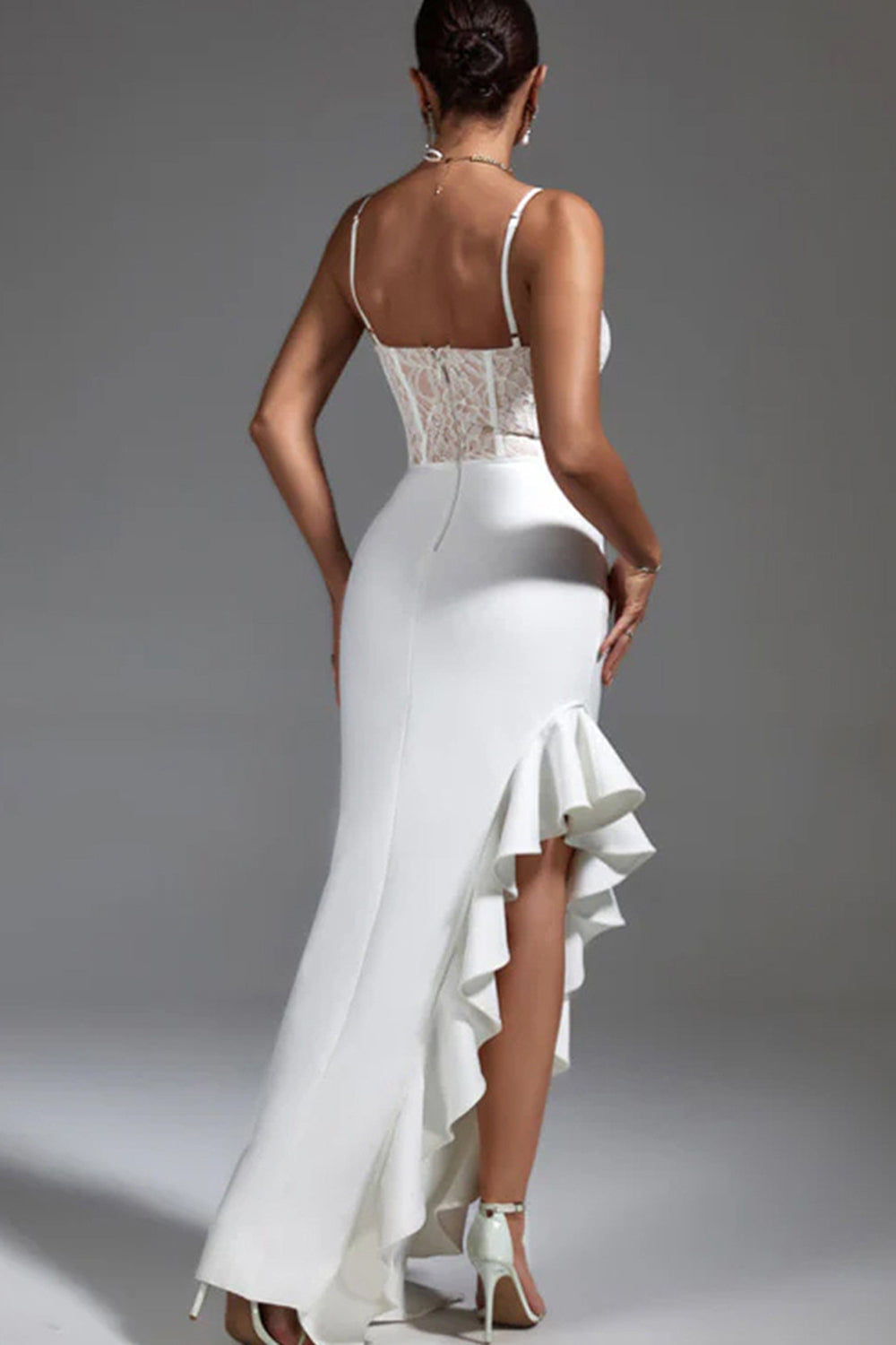 White Sheath Corset Spaghetti Straps Lace Prom Dress with Ruffle Slit