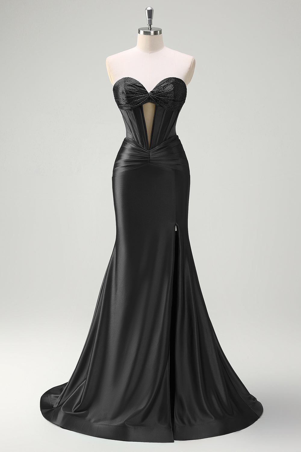 Sparkly Dark Green Mermaid Strapless Beaded Corset Ruched Satin Prom Dress with Slit