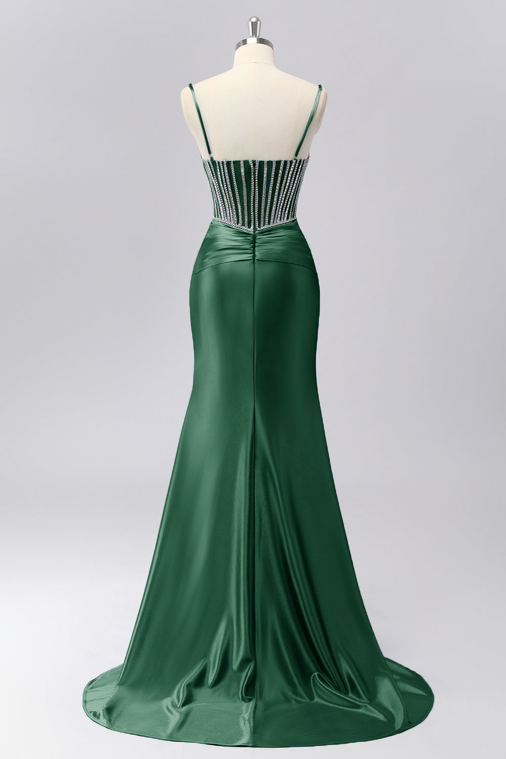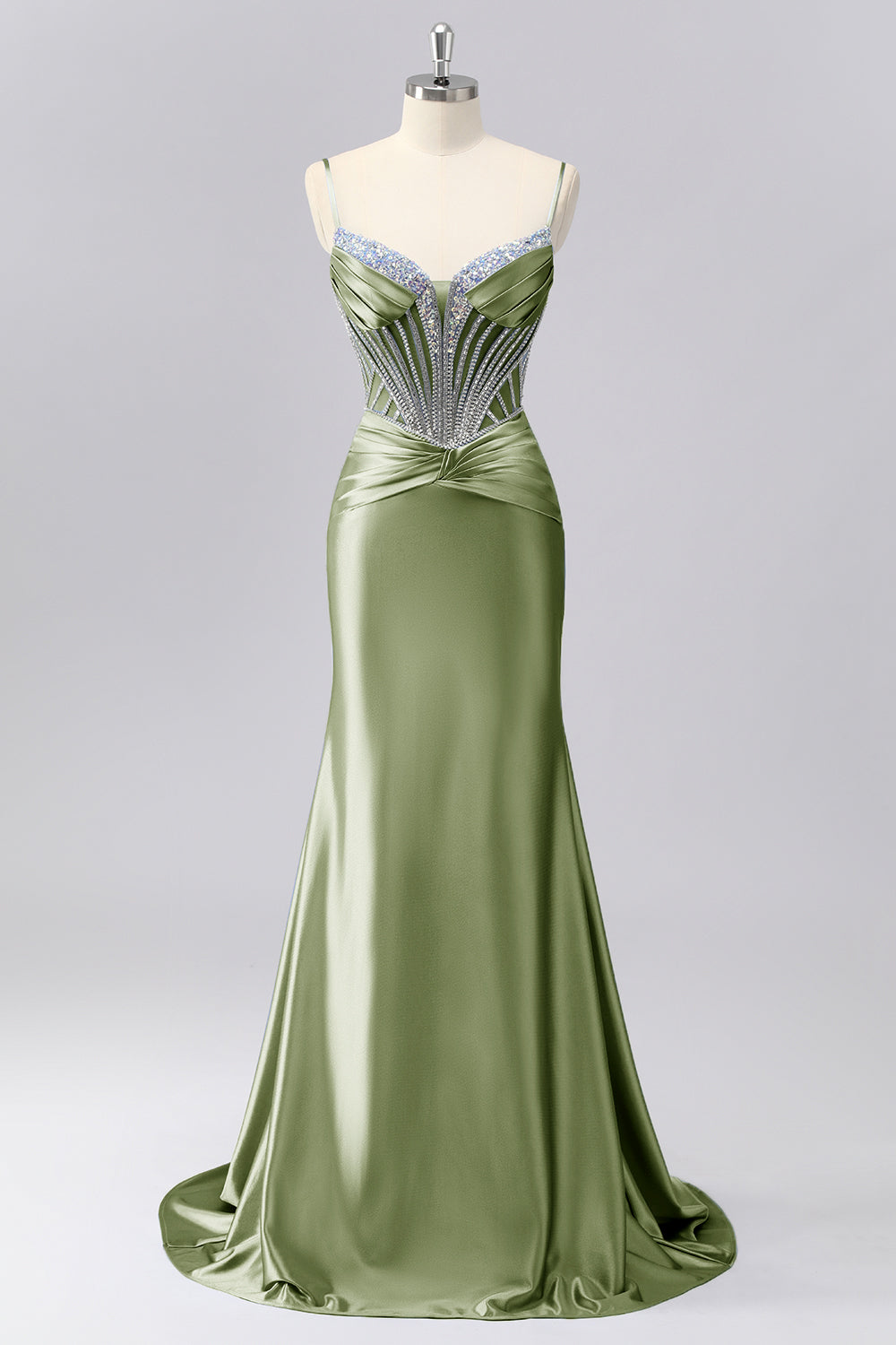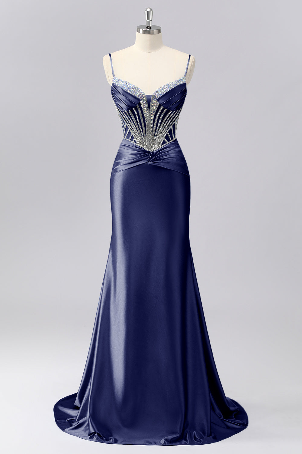 Sparkly Grey Blue Spaghetti Straps Mermaid Satin Prom Dress with Rhinestones