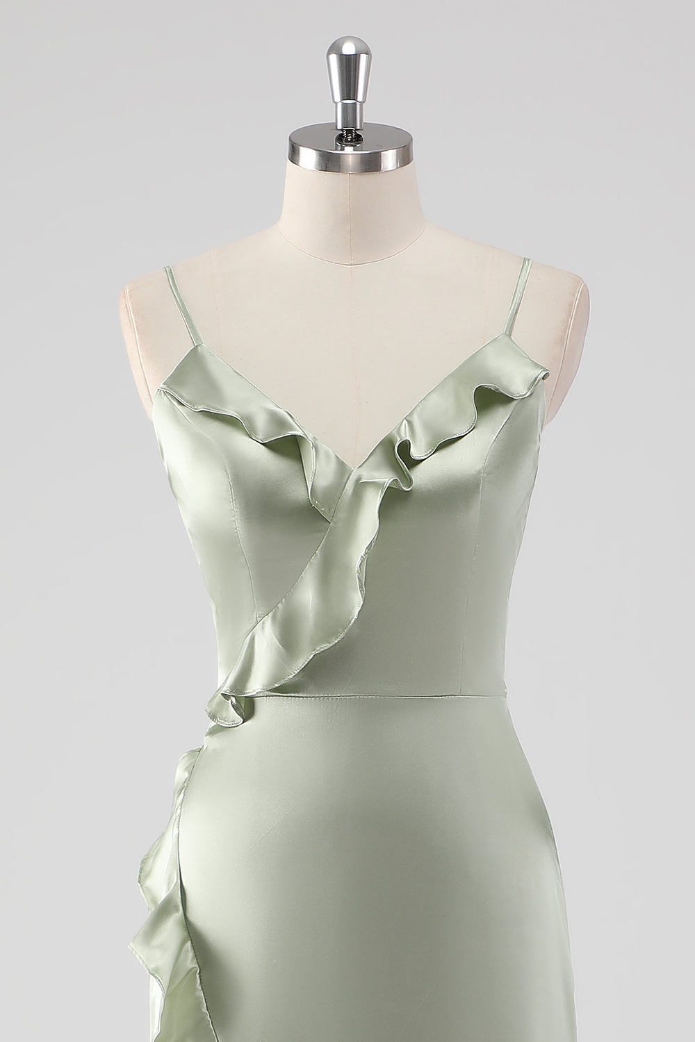 Sage Long Satin V Neck Ruffled Sheath Bridesmaid Dress