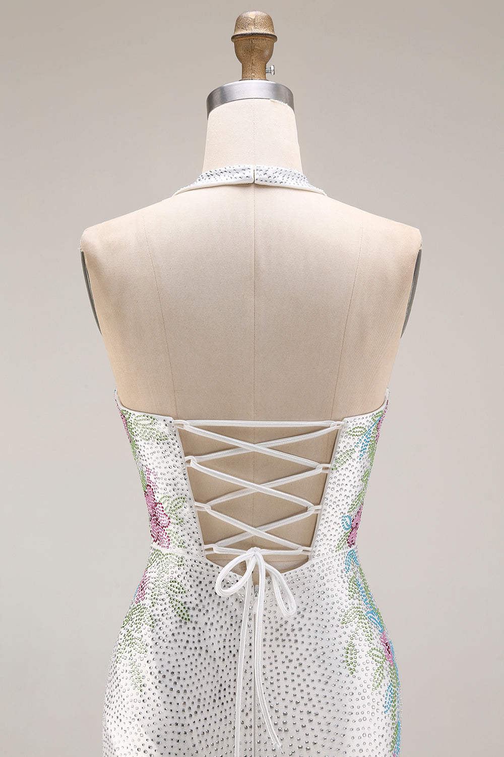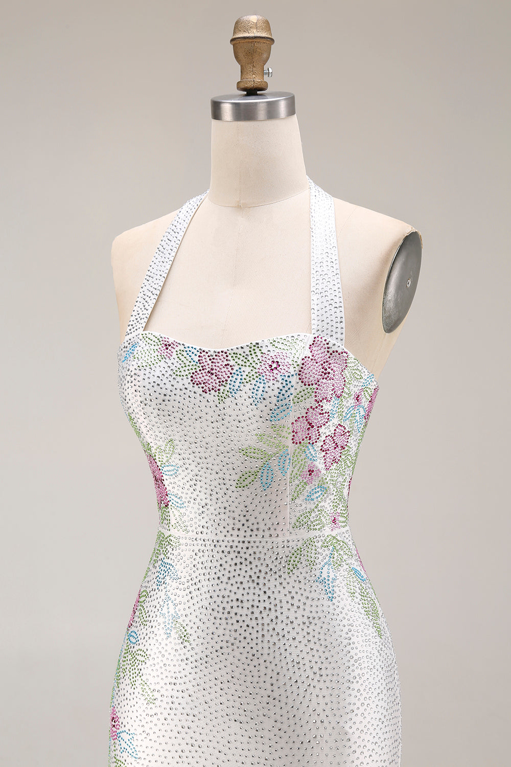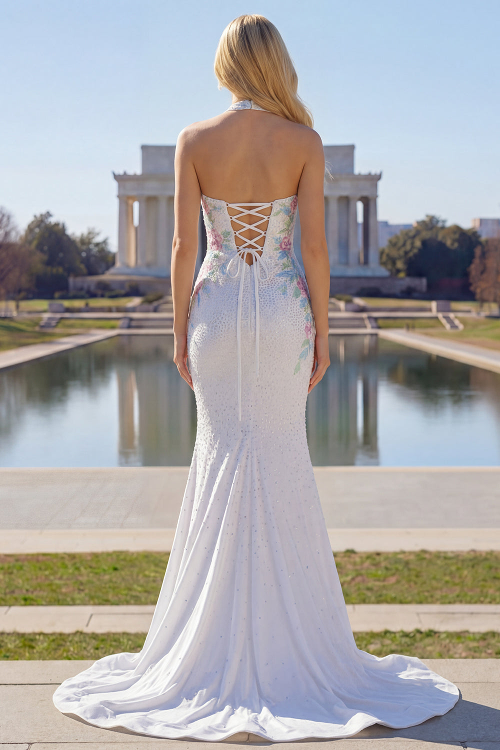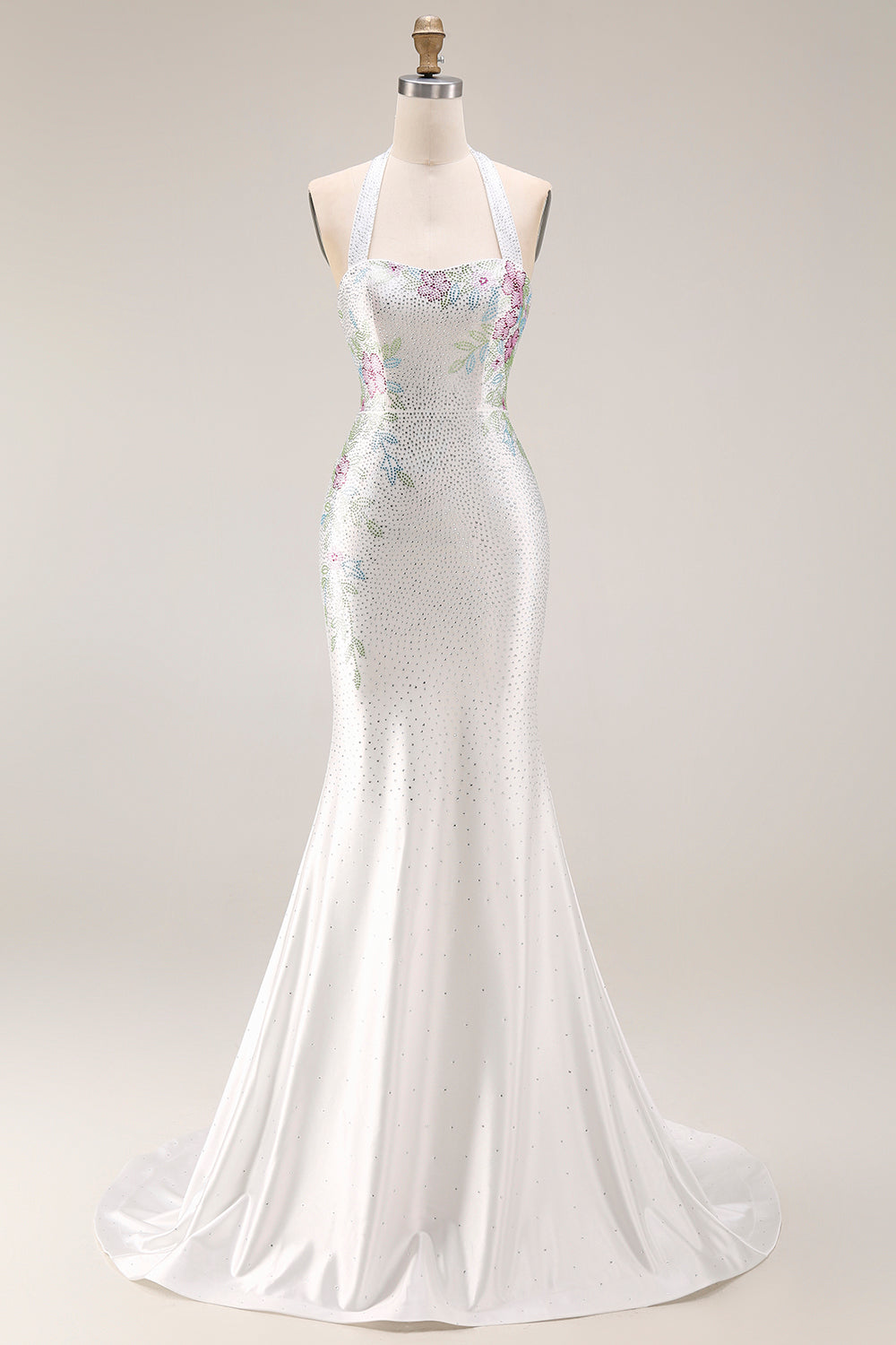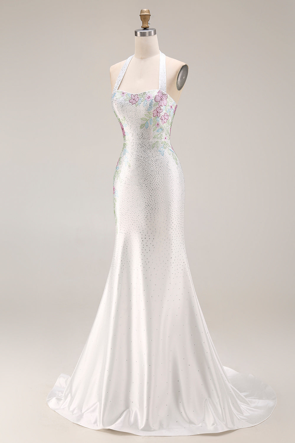 White Beaded Halter Mermaid Satin Long Prom Dress