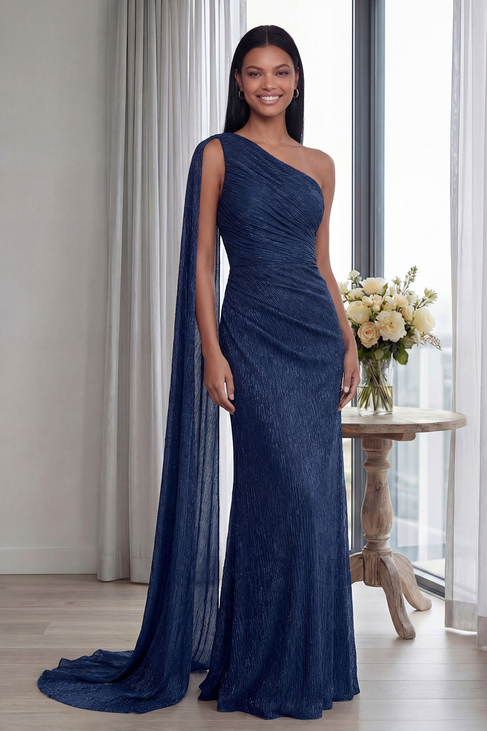 Navy One Shoulder Sheath Ruched Long Evening Dress with Side Cape