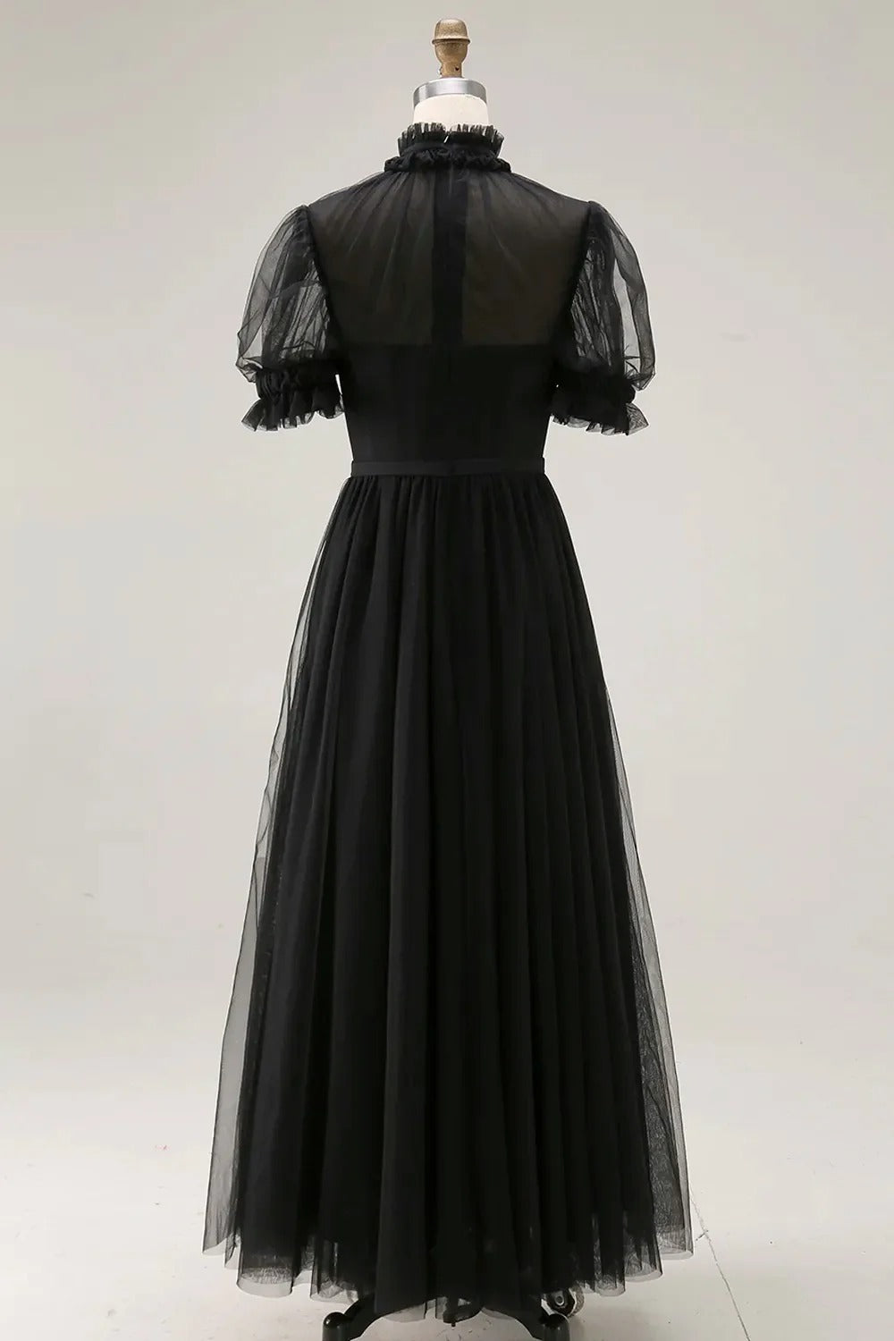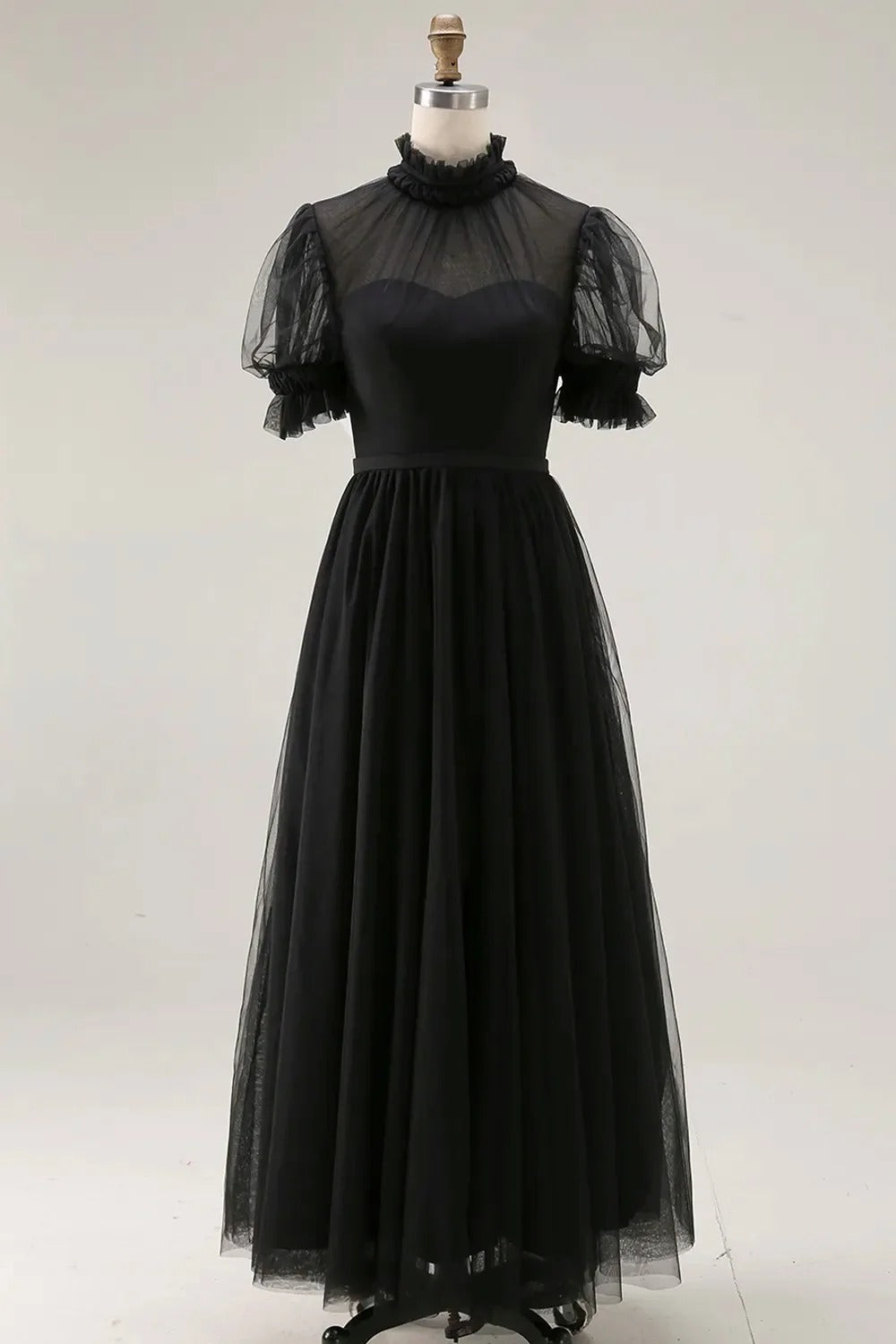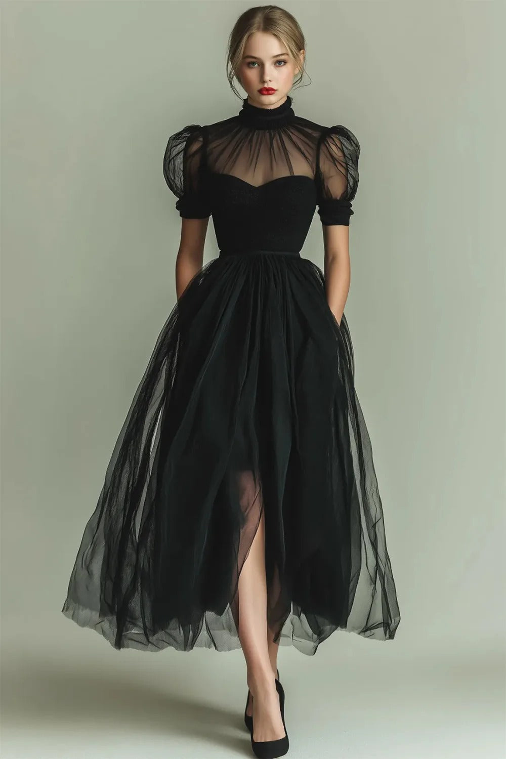 Dark Green A Line High Neck Tulle Midi Dress with Short Sleeves