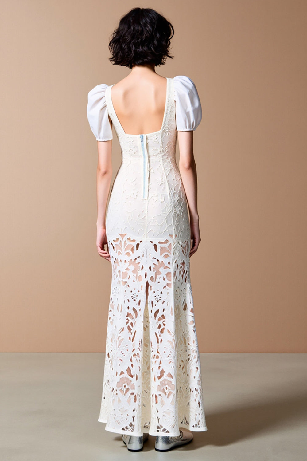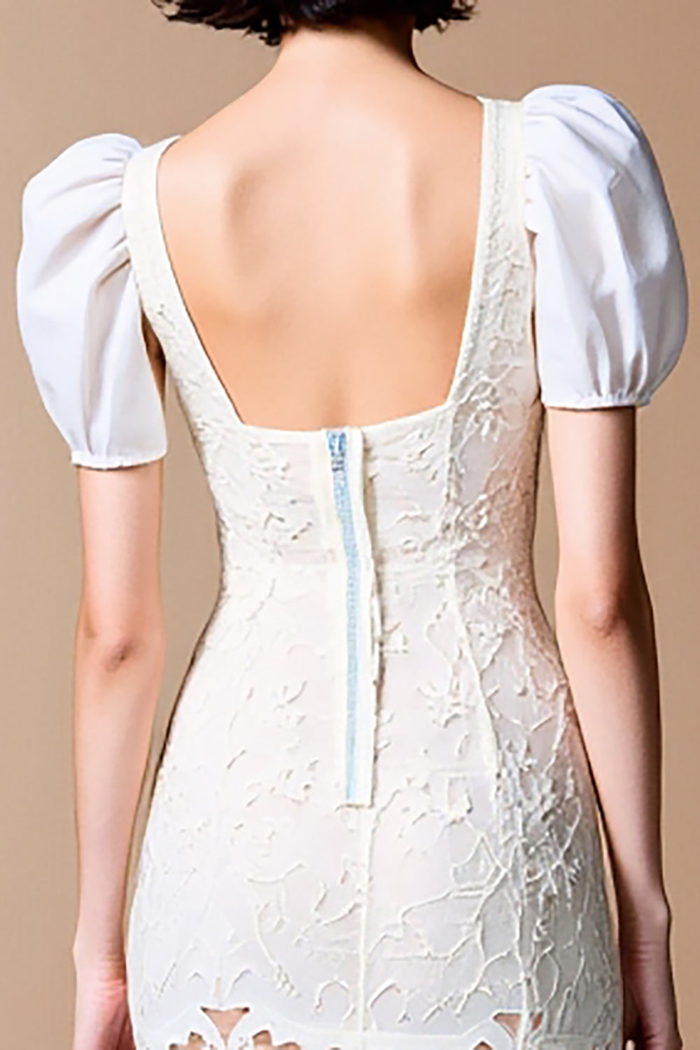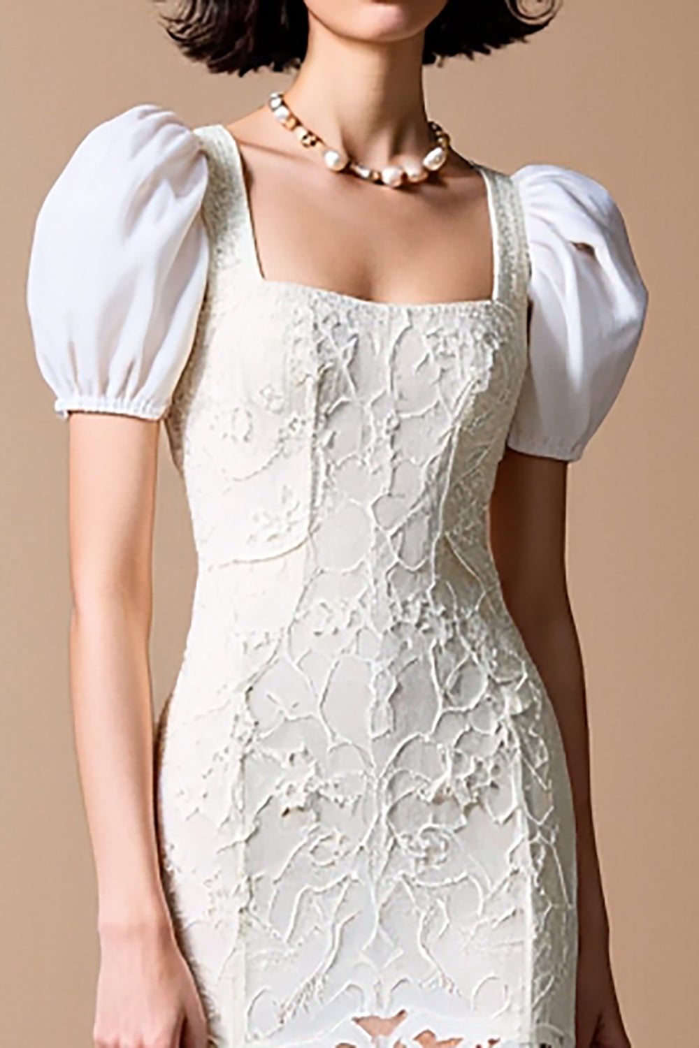 White Sheath Square Neck Lace Wedding Guest Dress
