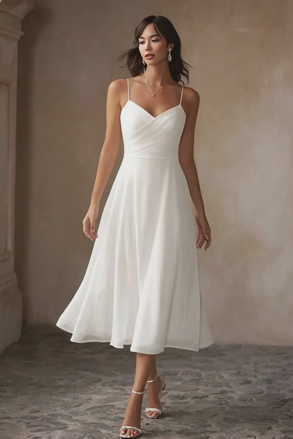 White A Line Chiffon Spaghetti Straps Midi Wedding Dress