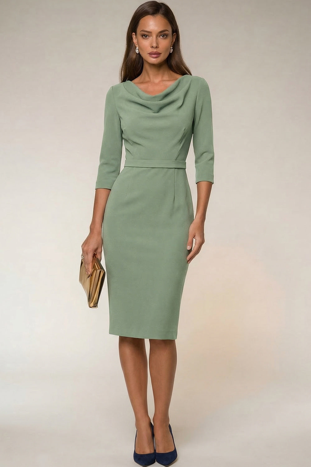 Cowl Neck Navy Bodycon 3/4 Sleeves Midi Work Dress