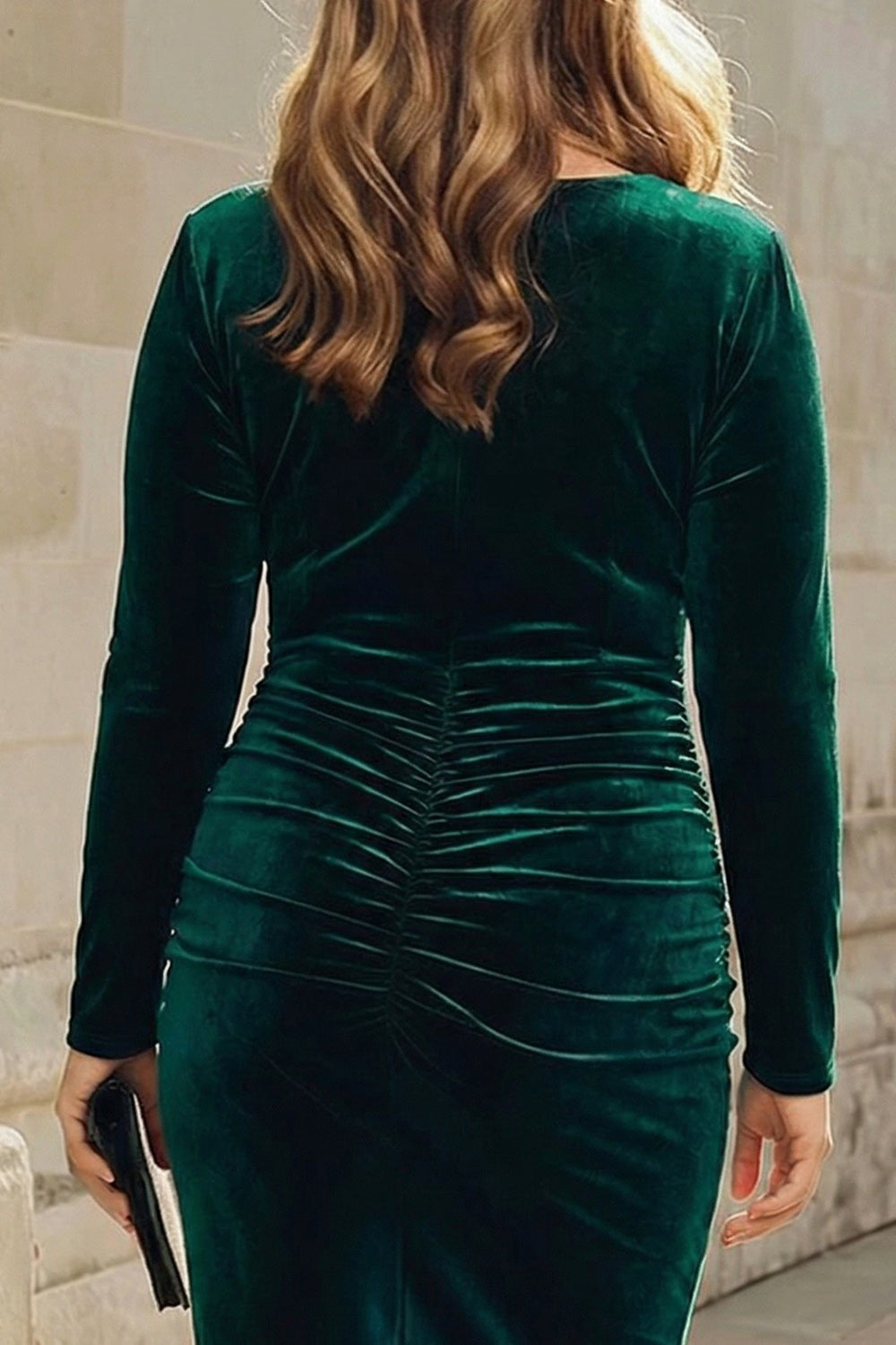 Plus Size Dark Green Sheath Velvet Ruched Midi Work Dress with Long Sleeve