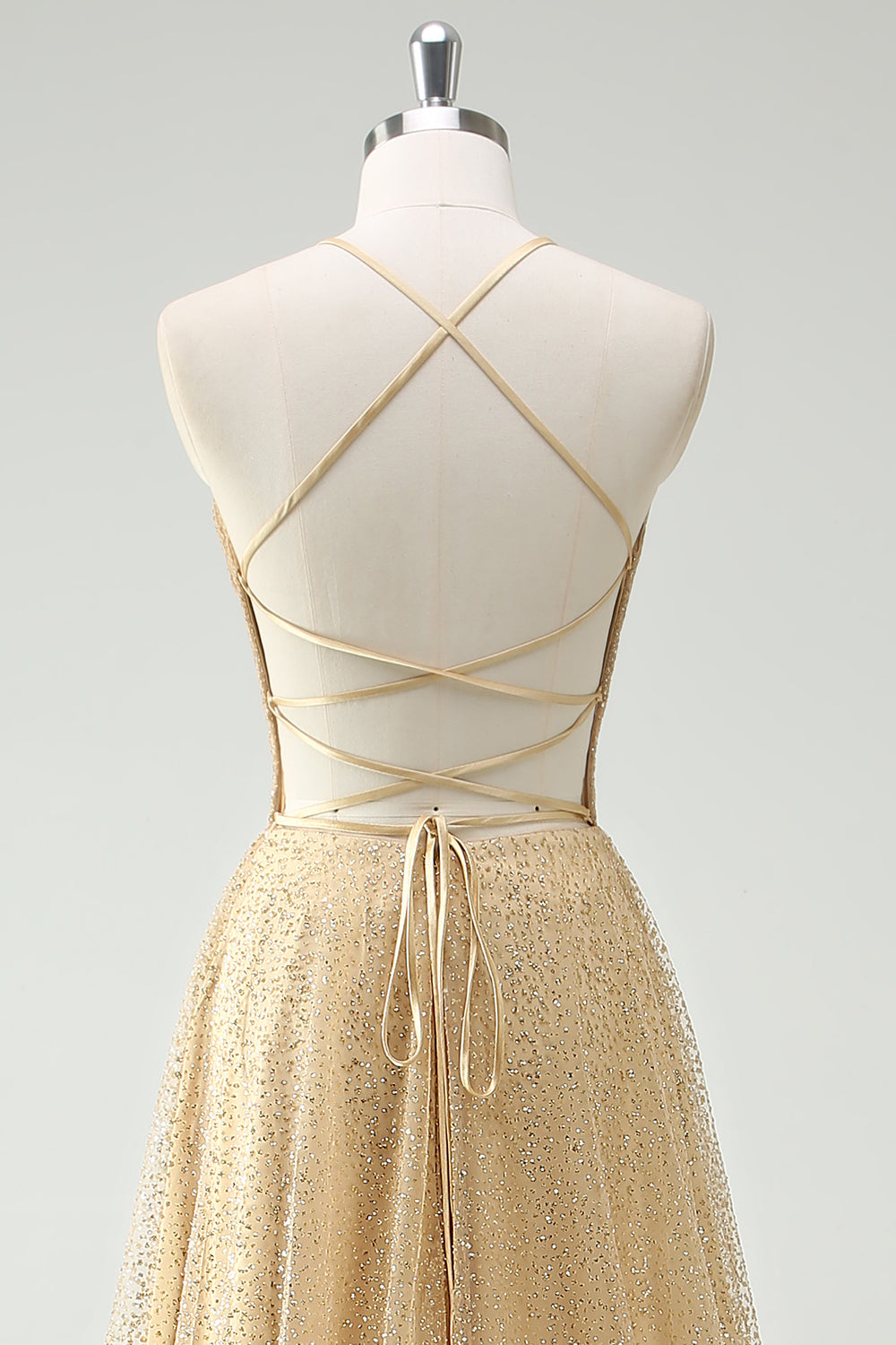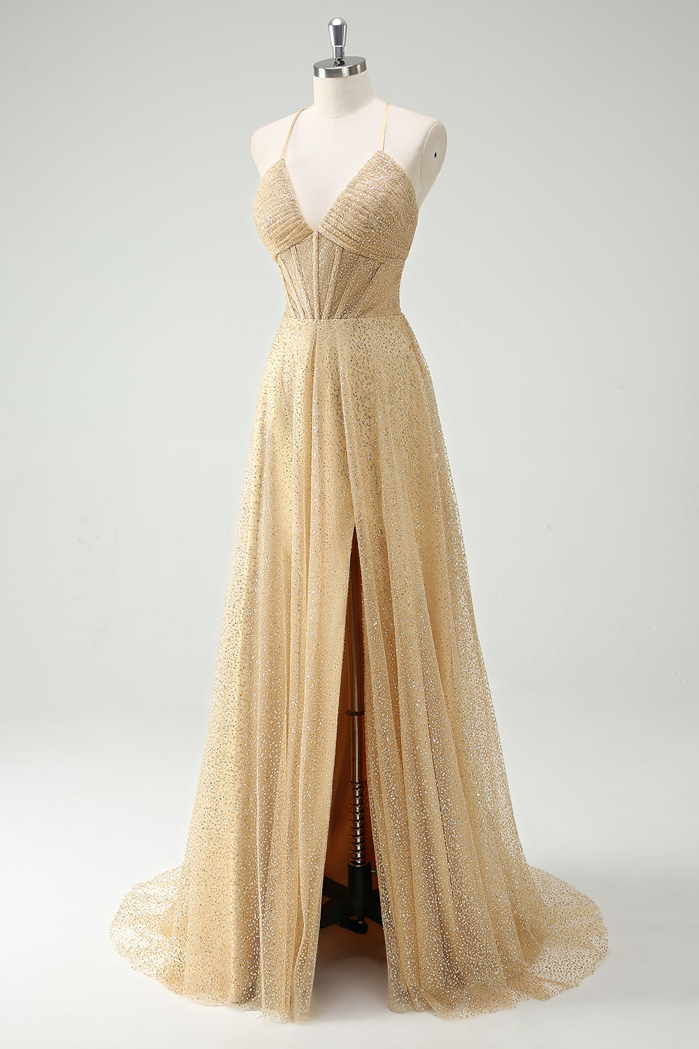A Line Gold Sequin Spaghetti Straps Prom Dress With Slit