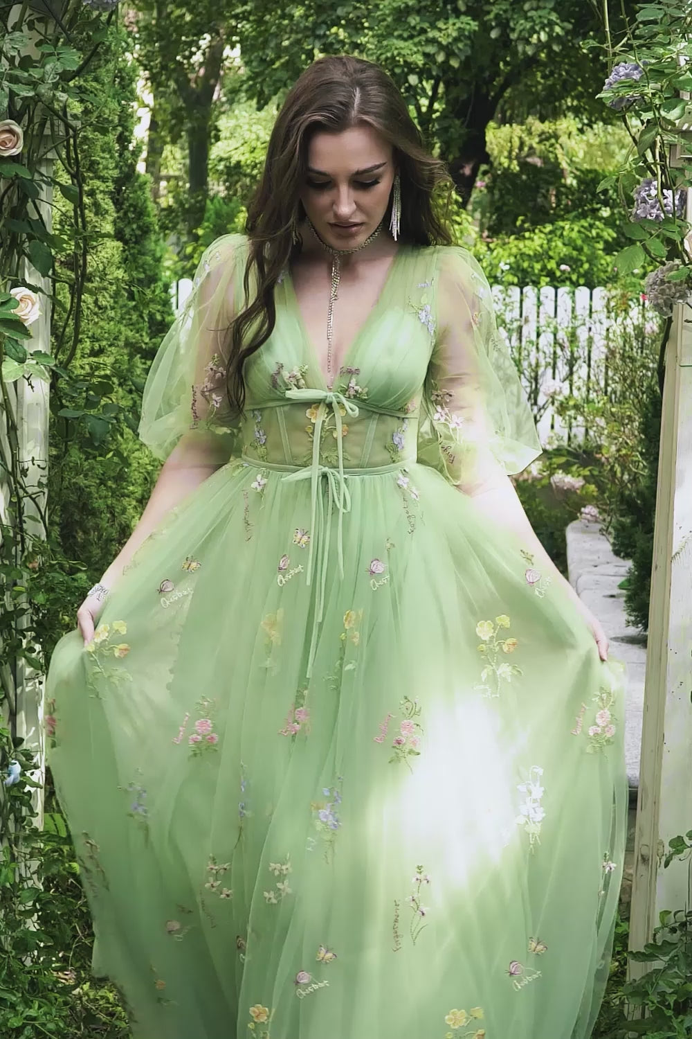 A-Line V-Neck Embroidery Green Long Prom Dress with Short Sleeves
