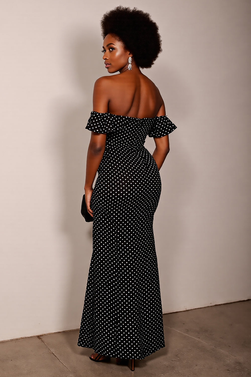 Black Off the Shoulder White Polka Dot Formal Dress with Slit