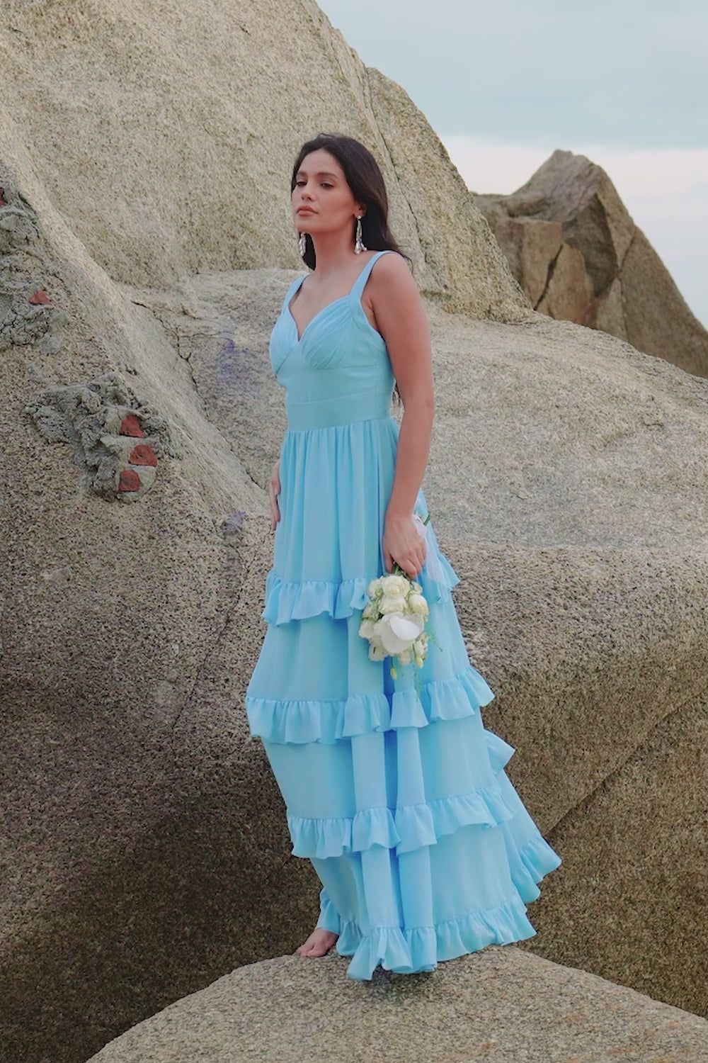 Blue A Line V Neck Tiered Chiffon Long Bridesmaid Dress