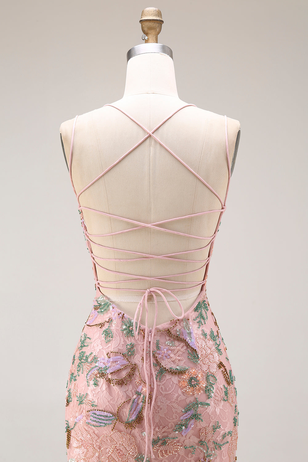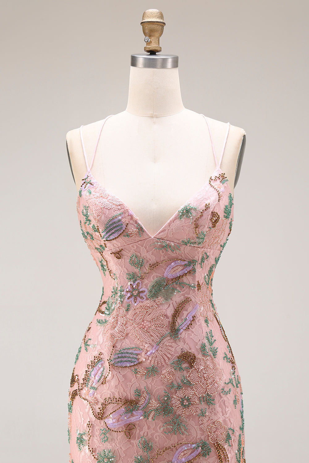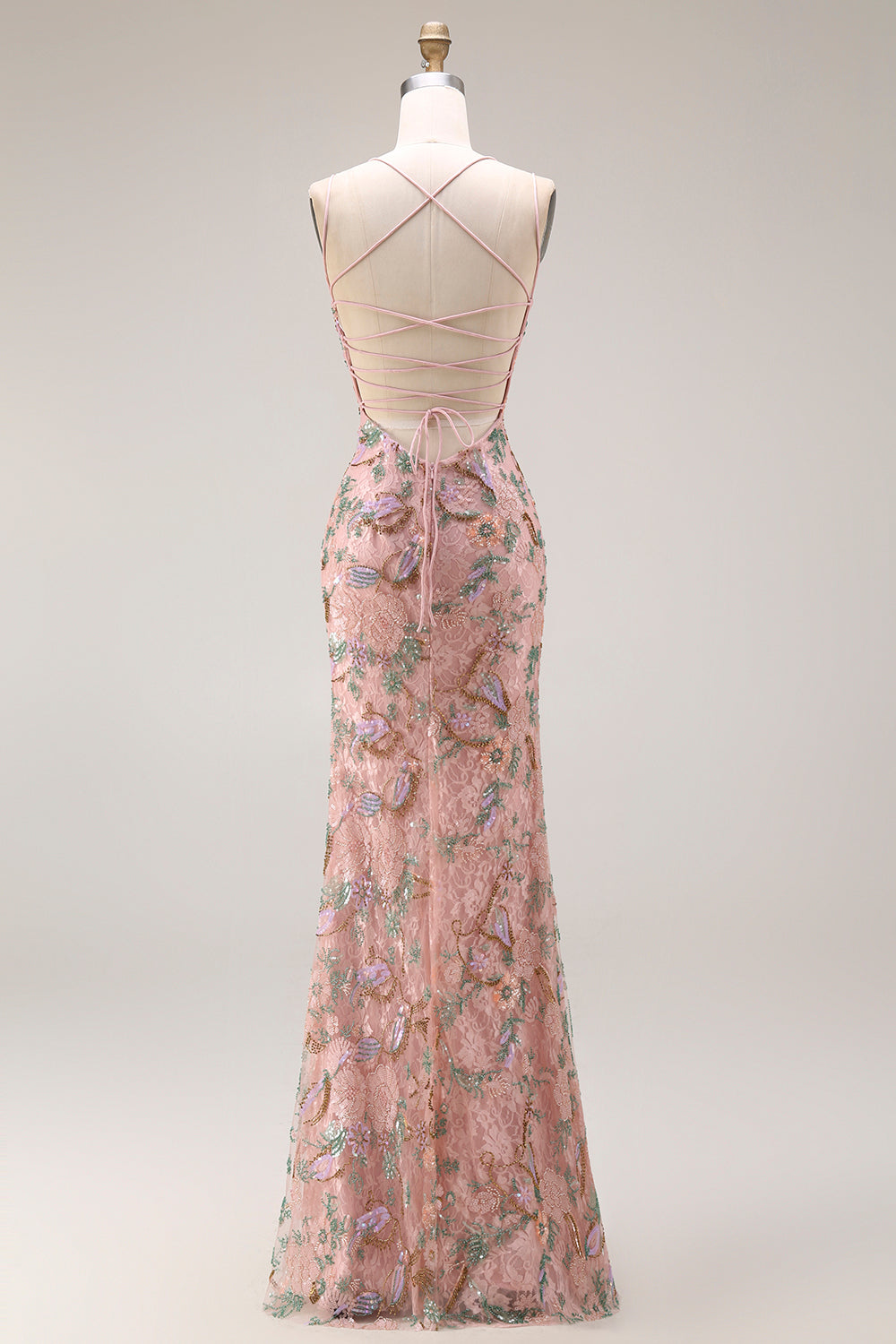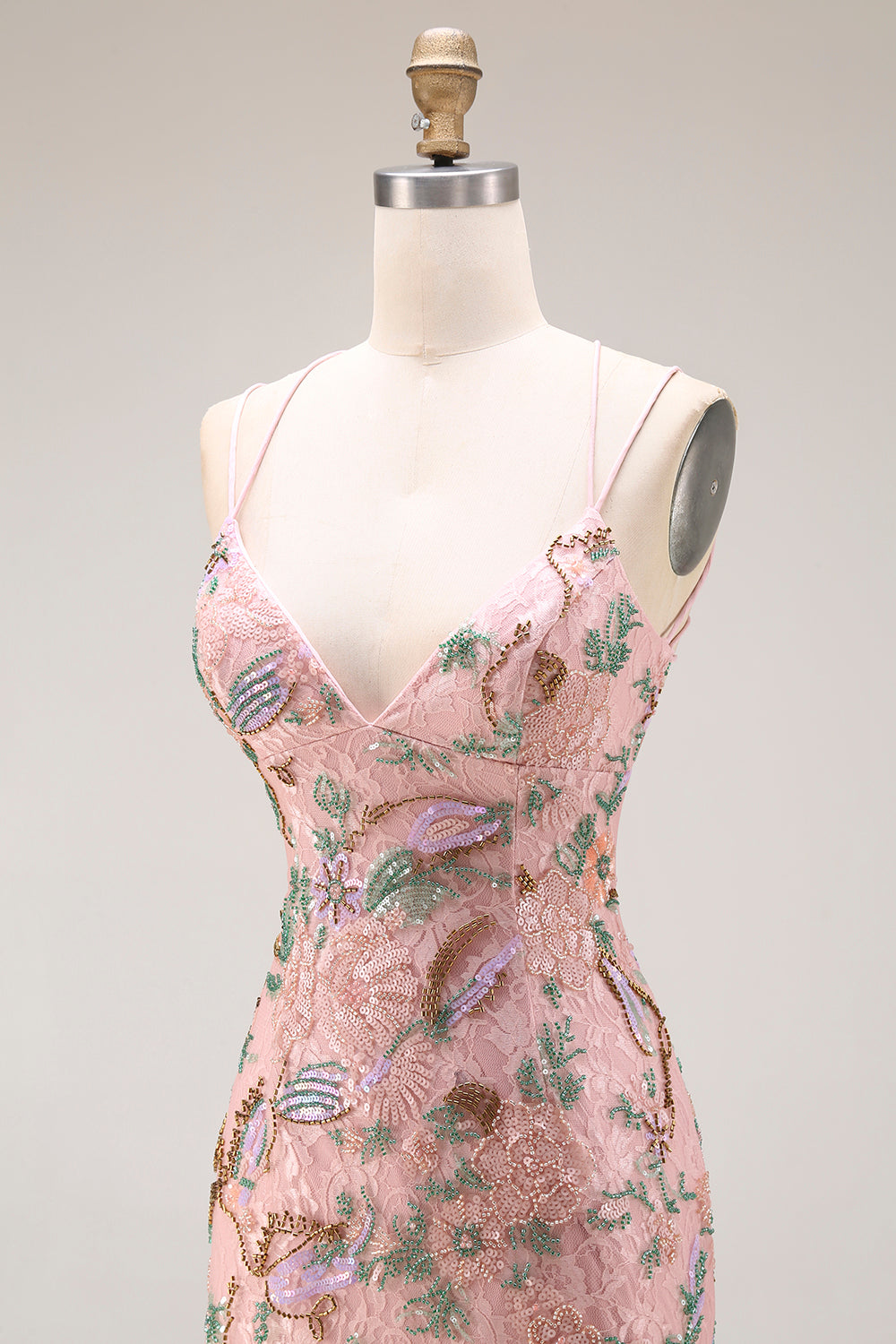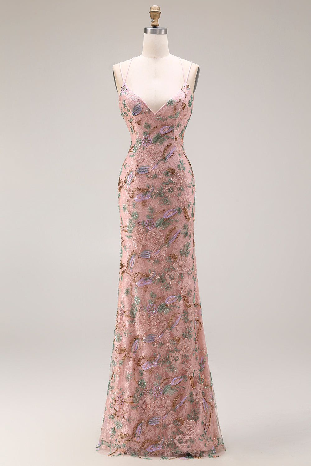 Blush Floral Sheath Spaghetti Straps Beaded Long Prom Dress with Sequins