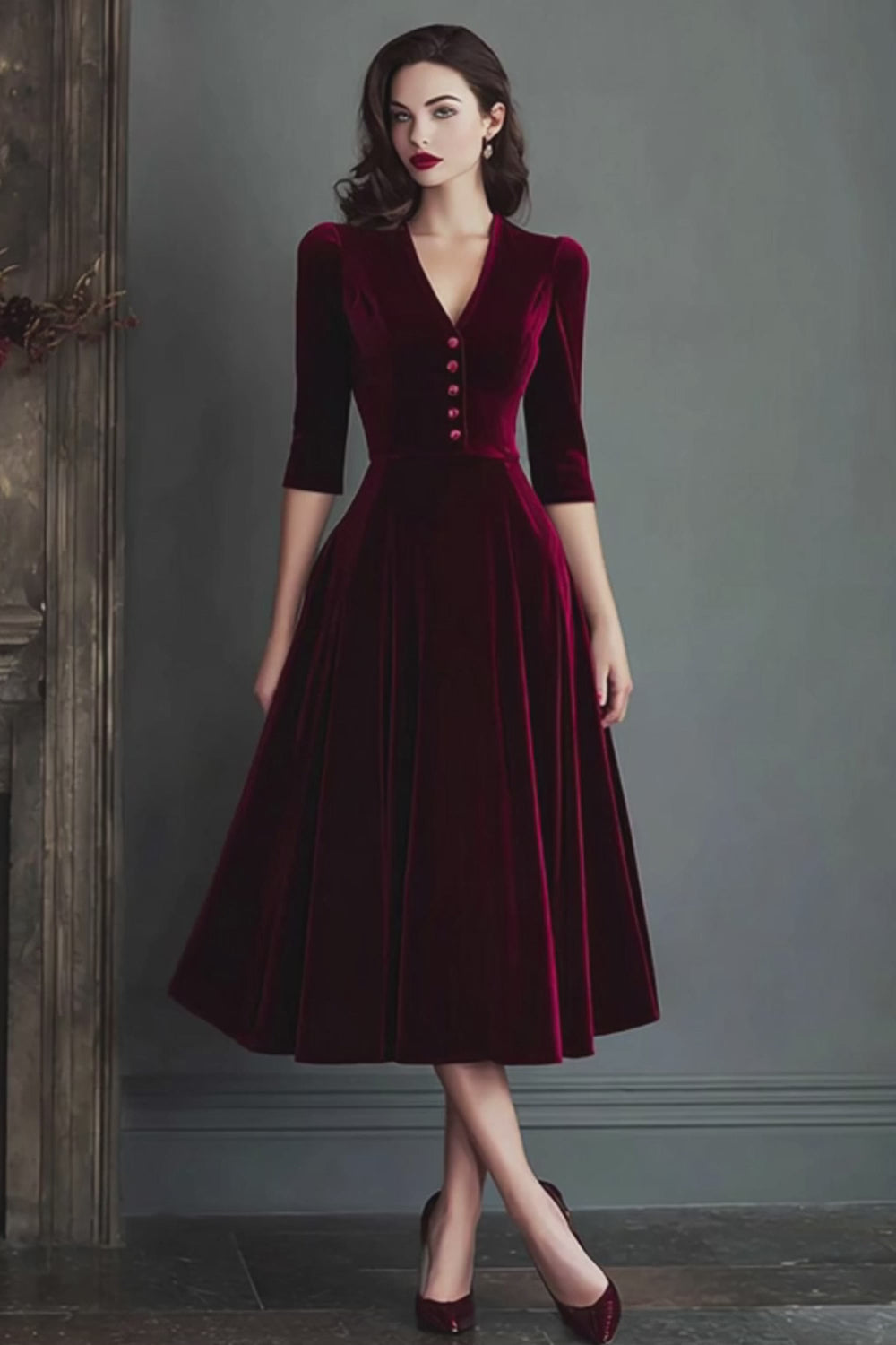 Burgundy A Line Velvet V-Neck Work Dress with Half Sleeves