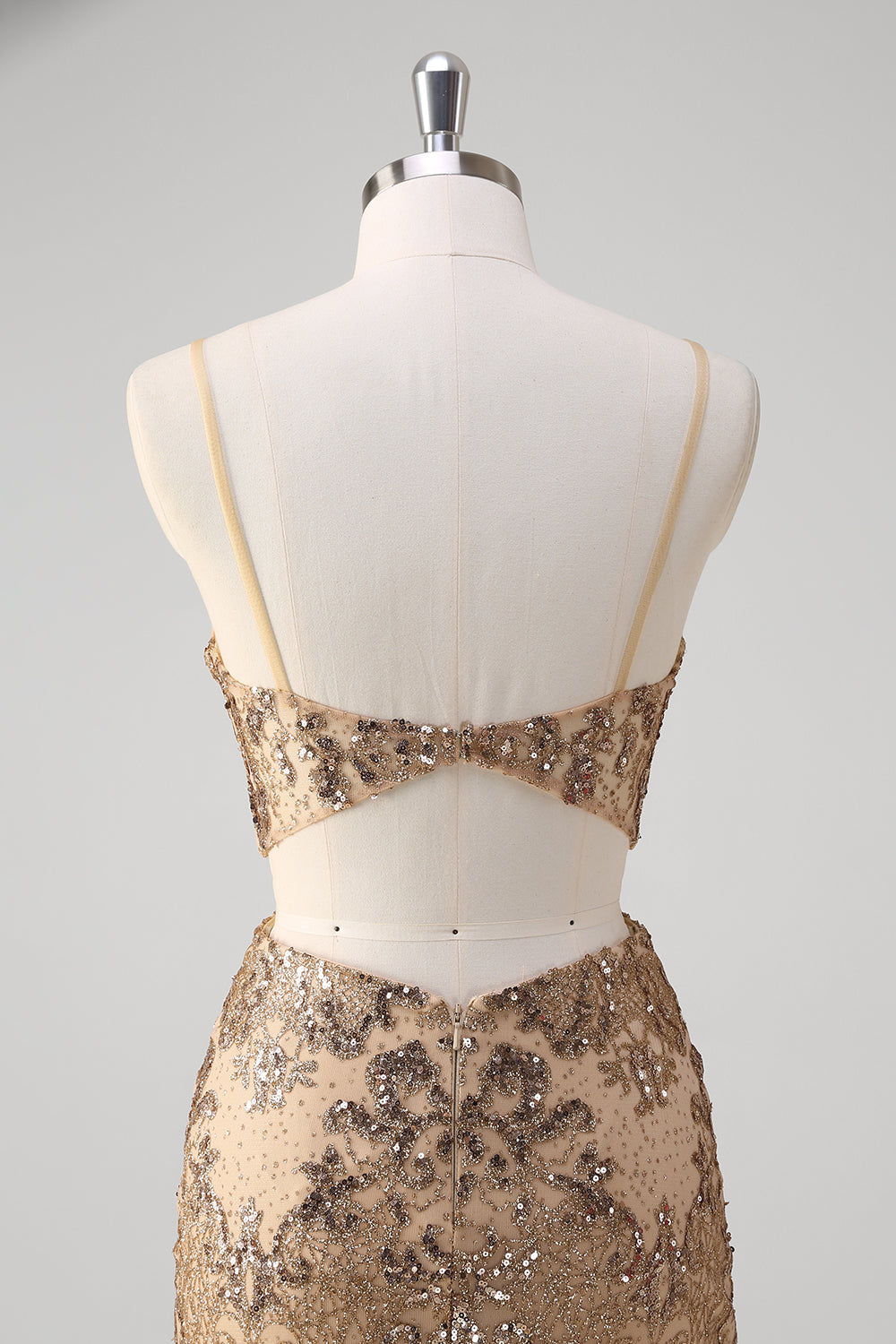 Champagne Mermaid Spaghetti Straps Sequin Hollow Out Prom Dress