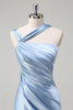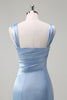 Elegant Sky Blue Sheath Pleated Satin Long Bridesmaid Dress With Slit