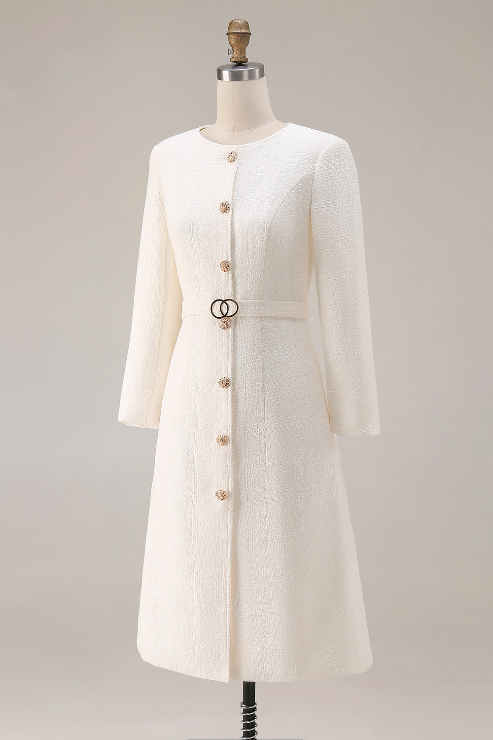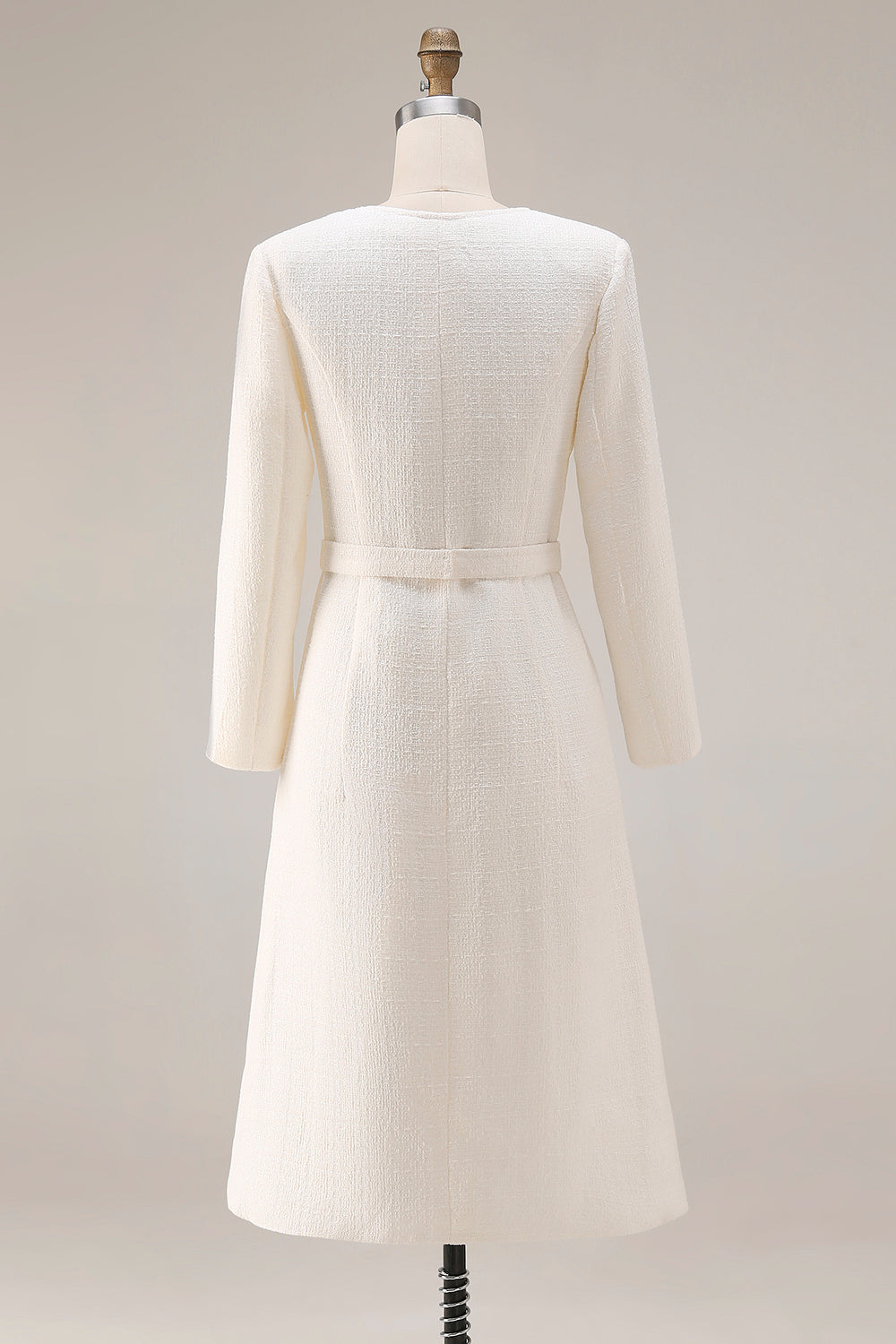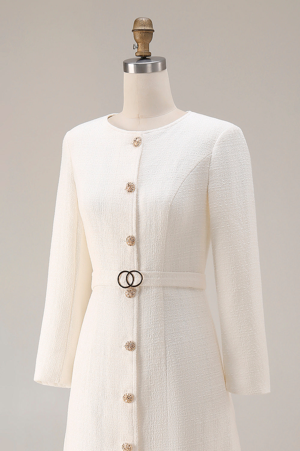 Ivory Sheath Tweed Long Sleeves Midi Work Dress with Belt