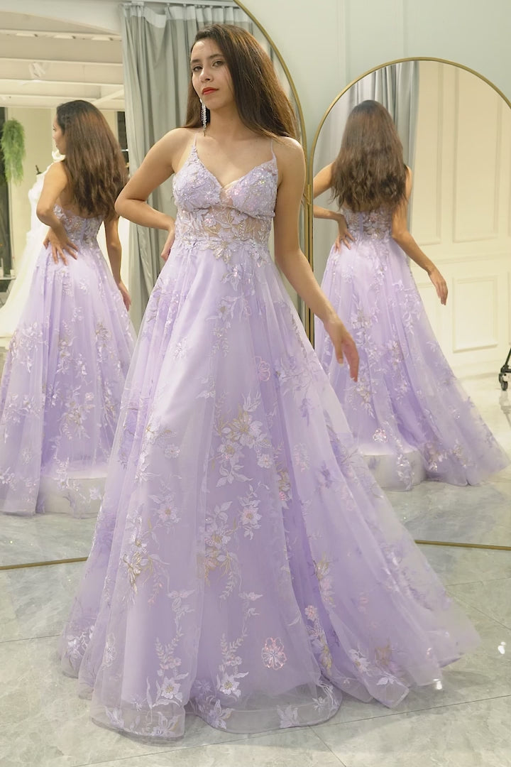 Lavender A-line Princess Tulle Prom Dress with Appliques