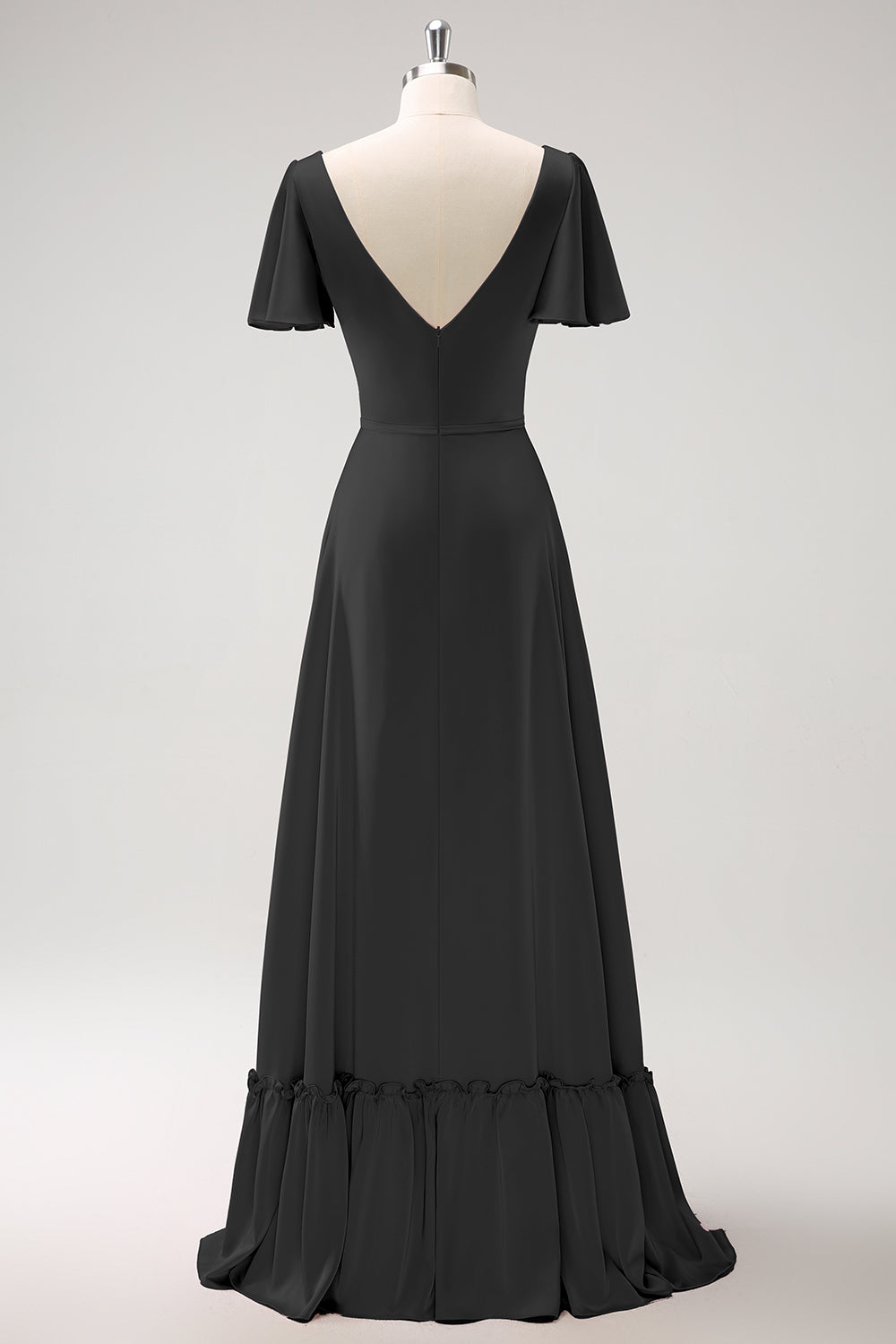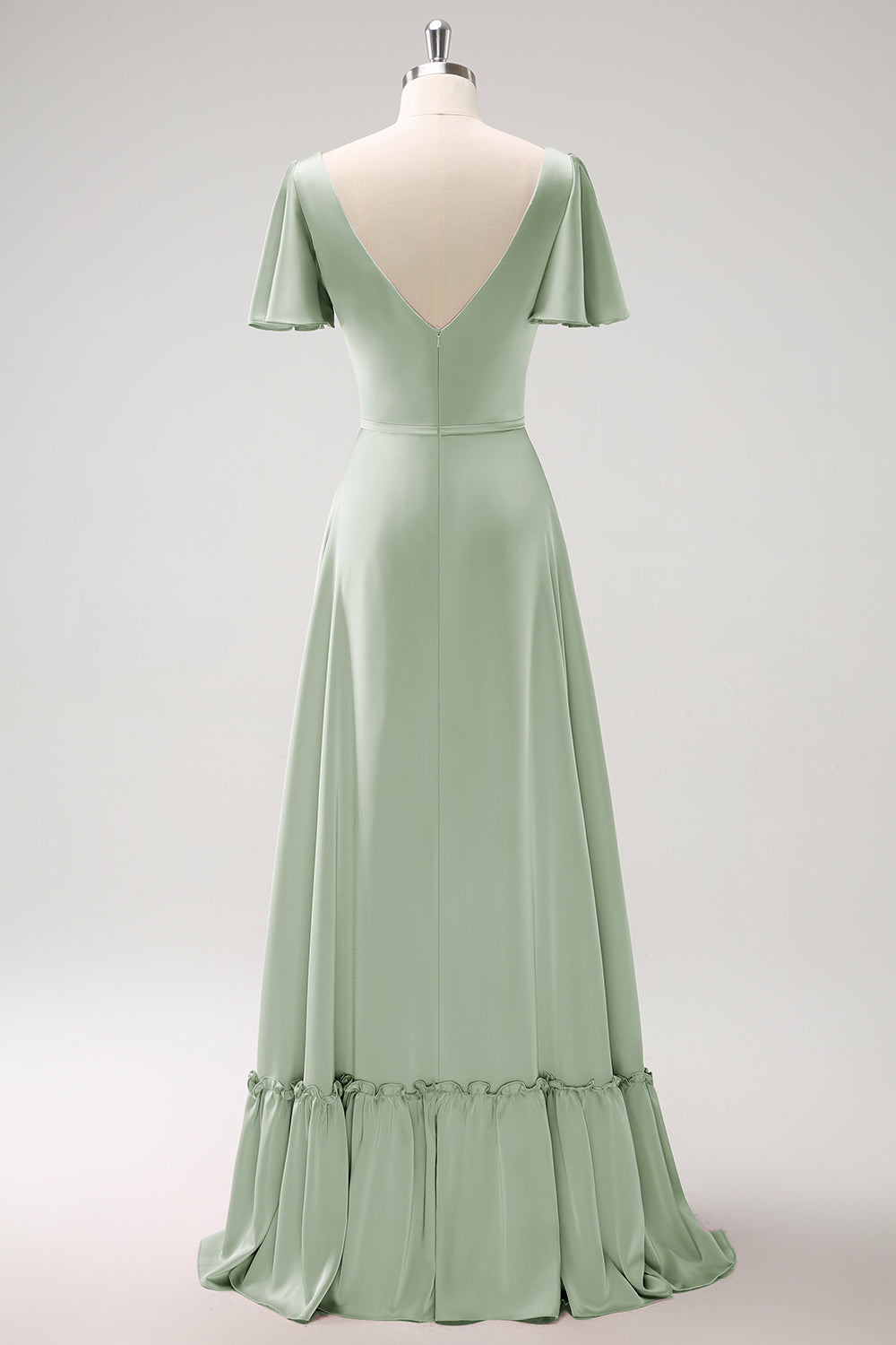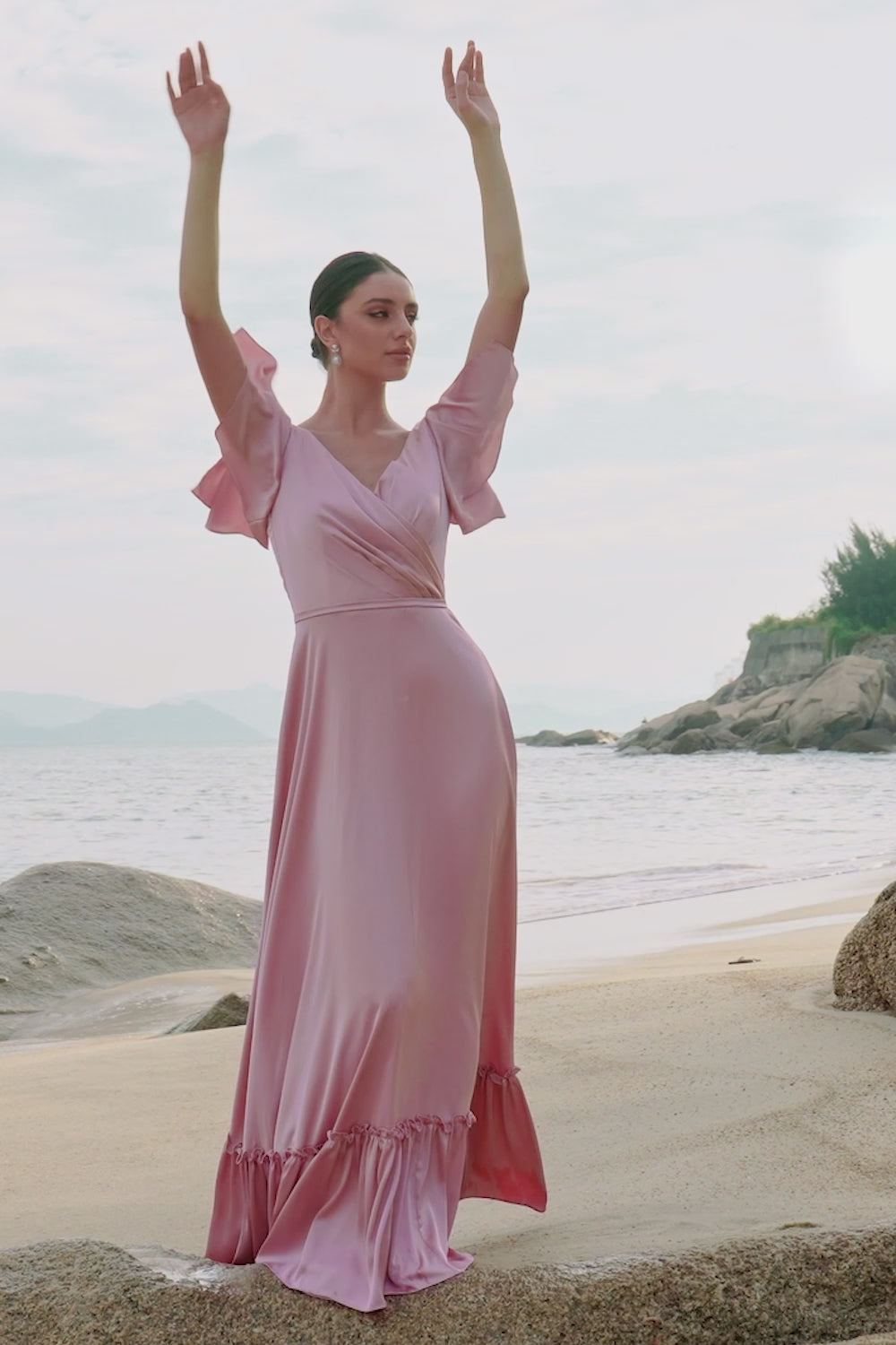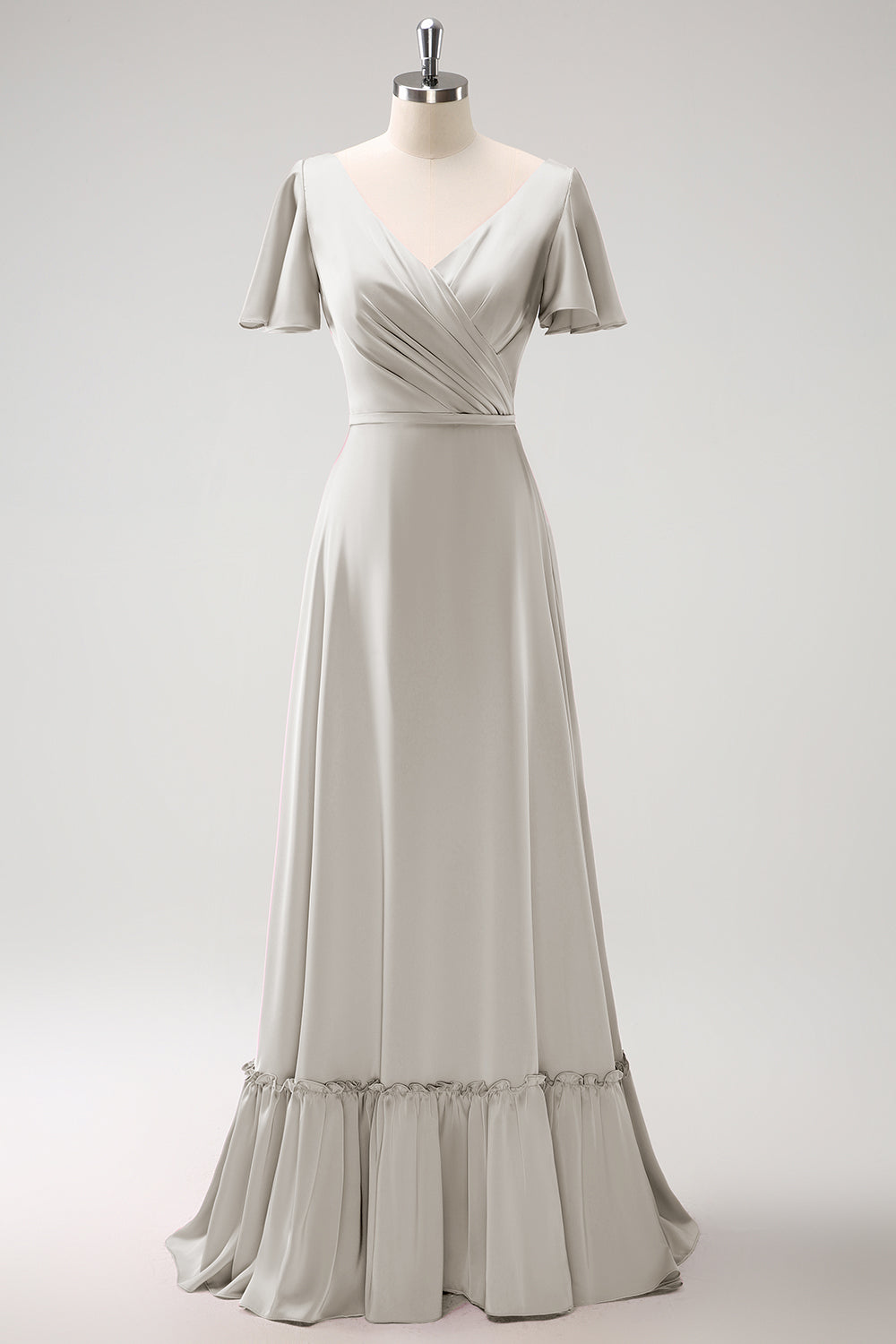 Pink A-Line Ruffle Wrap Short Sleeves Long Satin Bridesmaid Dress