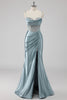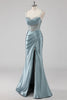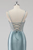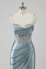 Sparkly Grey Blue Sheath Spaghetti Straps Corset Beading Long Prom Dress with Slit