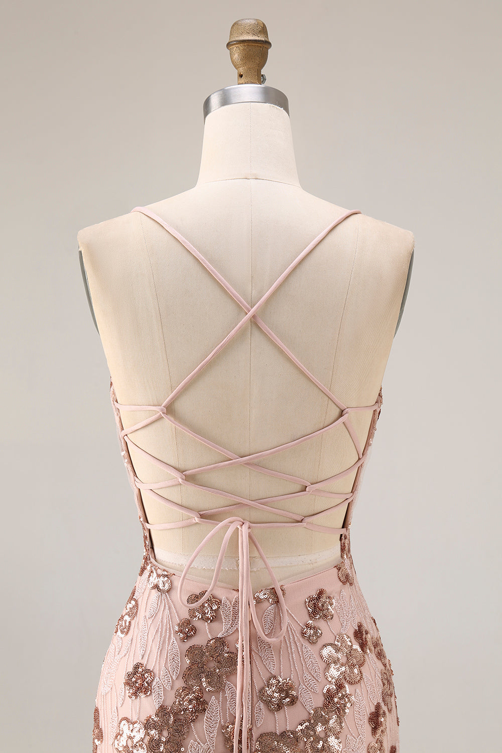 Sparkly Rose Golden Mermaid Lace Up Back Long Prom Dress with Sequins
