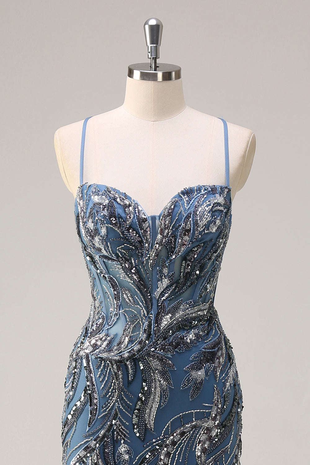 Sparkly Sage Spaghetti Straps Mermaid Long Sequin Prom Dress with Slit