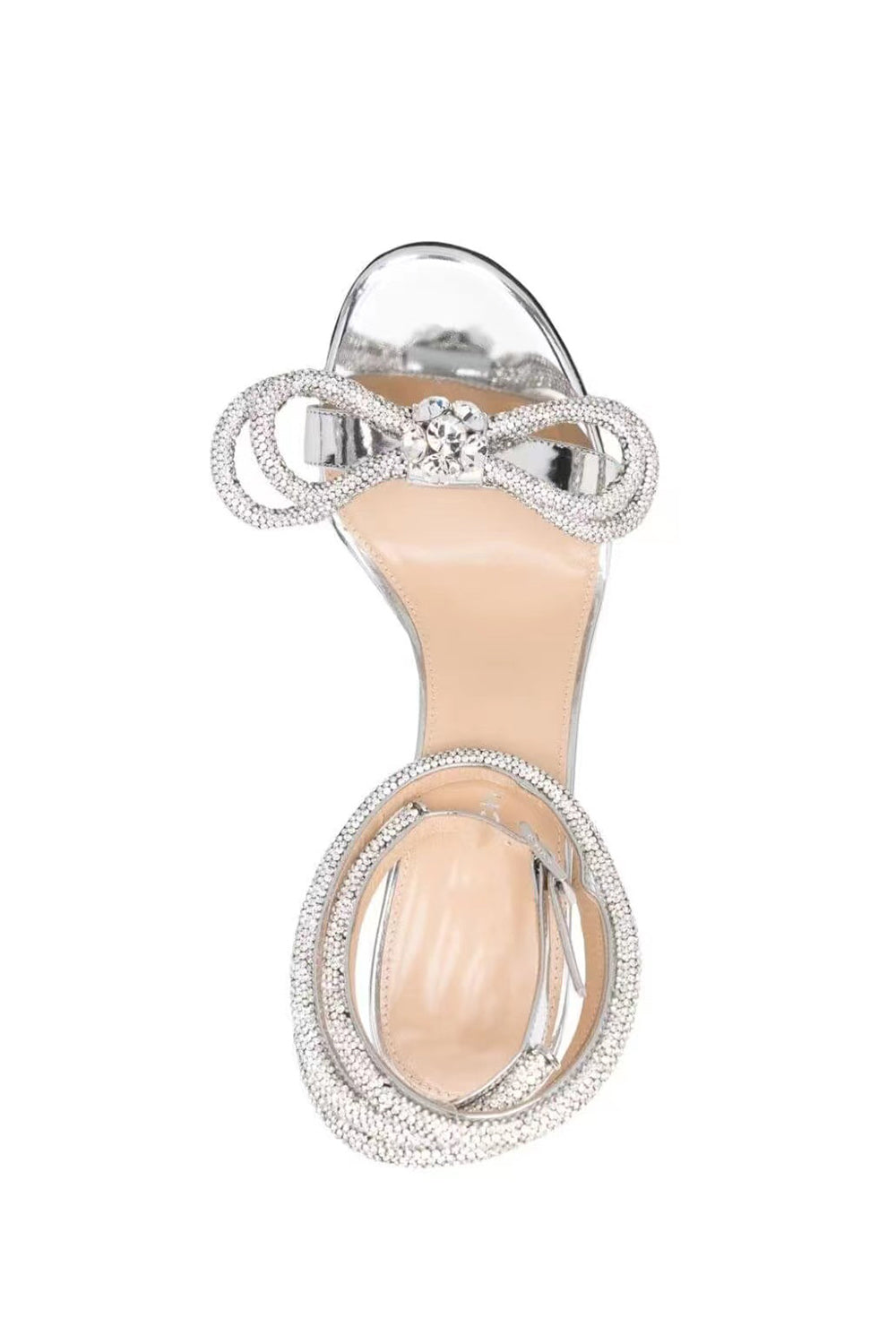 Sparkly Silver Rhinestones Bow Ankle Straps Open Toe High Heels